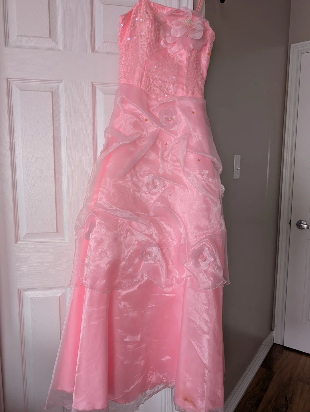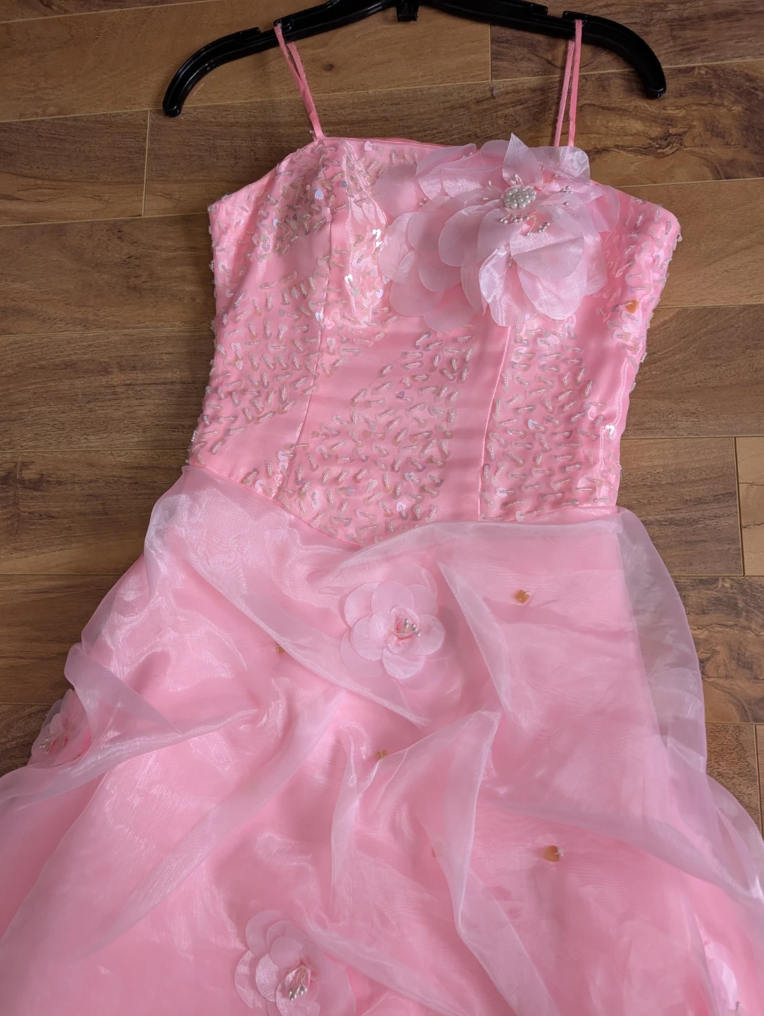 This beautiful pink formal gown features delicate beading on the bodice and floral accents throughout the layered skirt. It's crafted from shimmering organza and satin for a dazzling effect. Perfect for special occasions! sweet fifteen, (quinceañera)