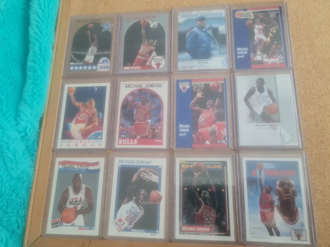 Collection of Michael Jordan basketball trading cards from various sets. Includes cards from NBA Hoops, Fleer, and other brands. Cards depict Jordan in his Bulls uniform and USA Basketball team gear.