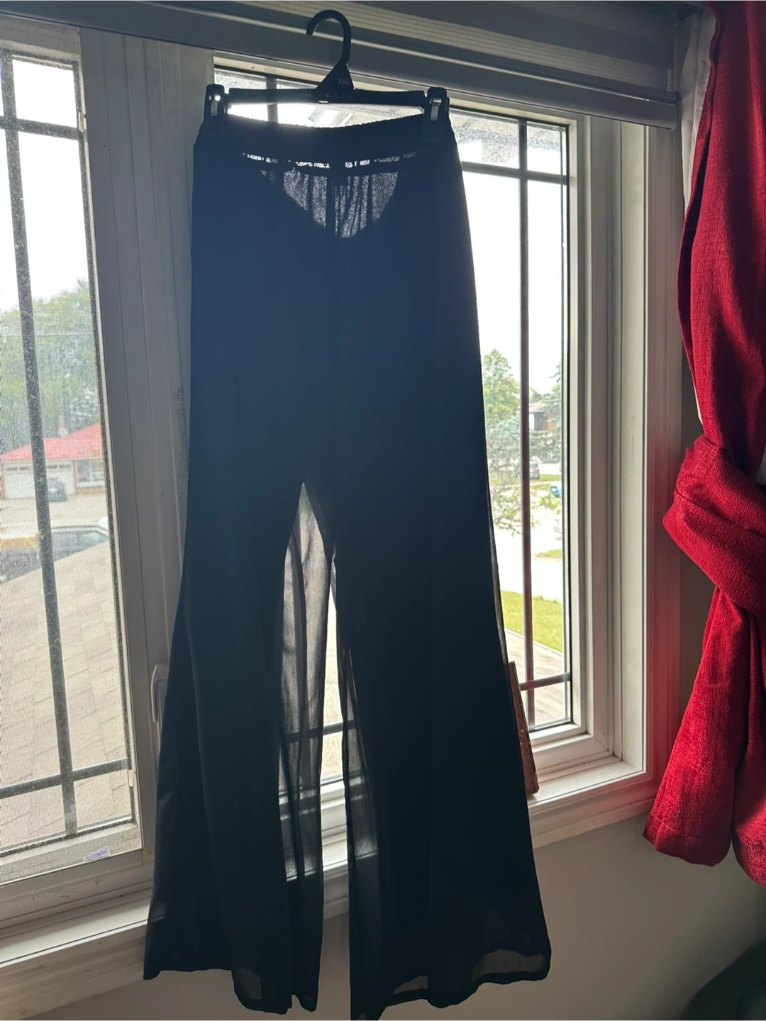 Selling a pair of new, never worn black wide-leg chiffon pants. They're a size medium and have a comfortable elastic waistband. Perfect for a flowy, elegant look!