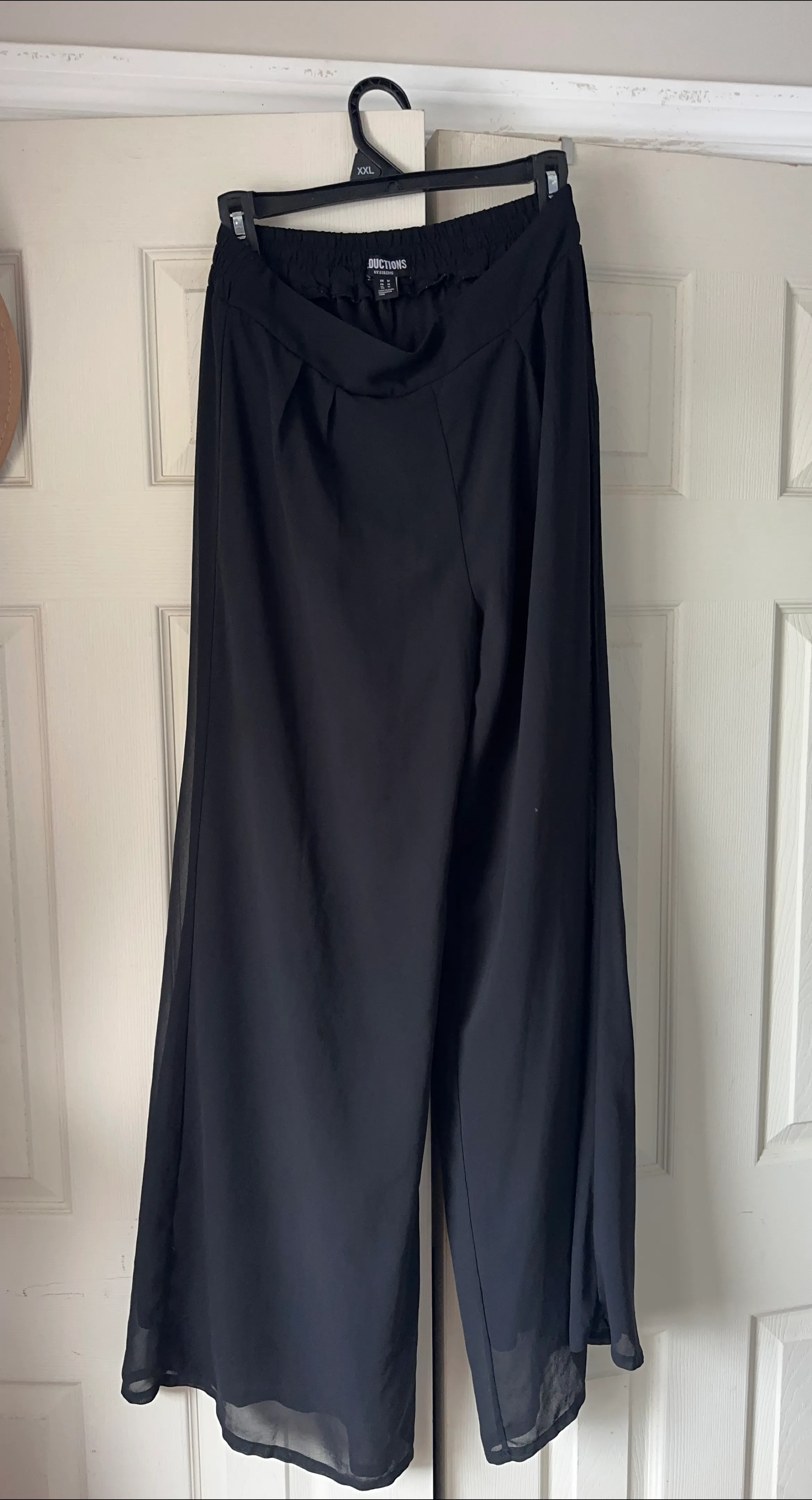 Selling a pair of new, never worn black wide-leg chiffon pants. They're a size medium and have a comfortable elastic waistband. Perfect for a flowy, elegant look!