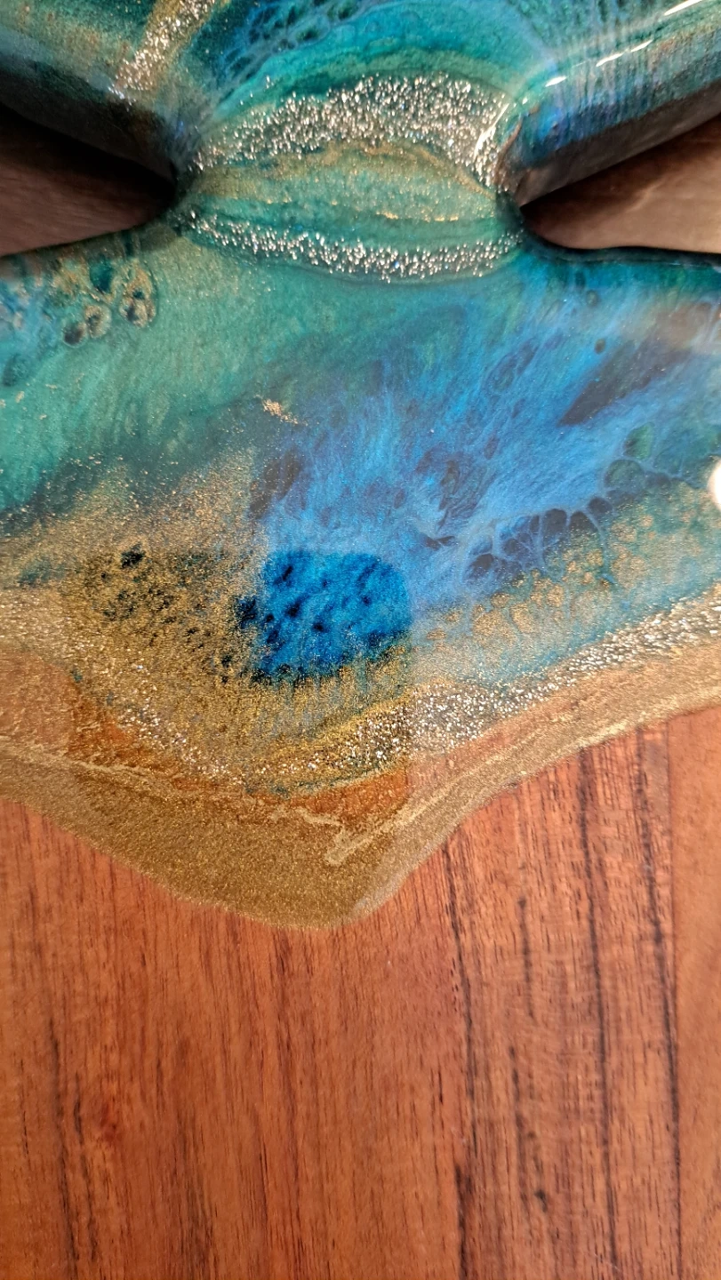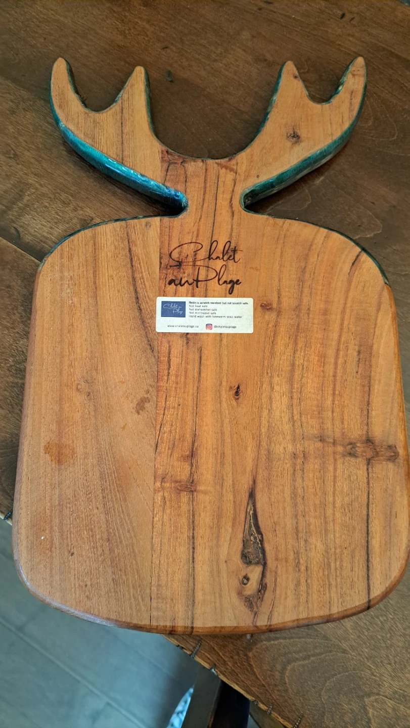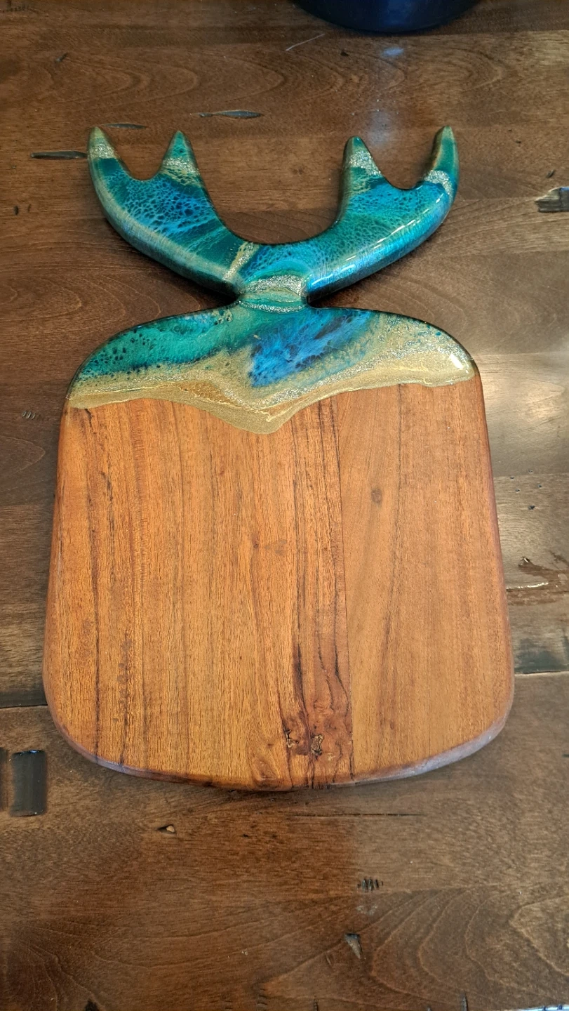 unique Handmade wooden charcuterie board featuring a moose antler design with blue and gold resin. Resin is scratch resistant but not scratch safe; not heat, microwave, or dishwasher safe. Hand wash with lukewarm soap water.