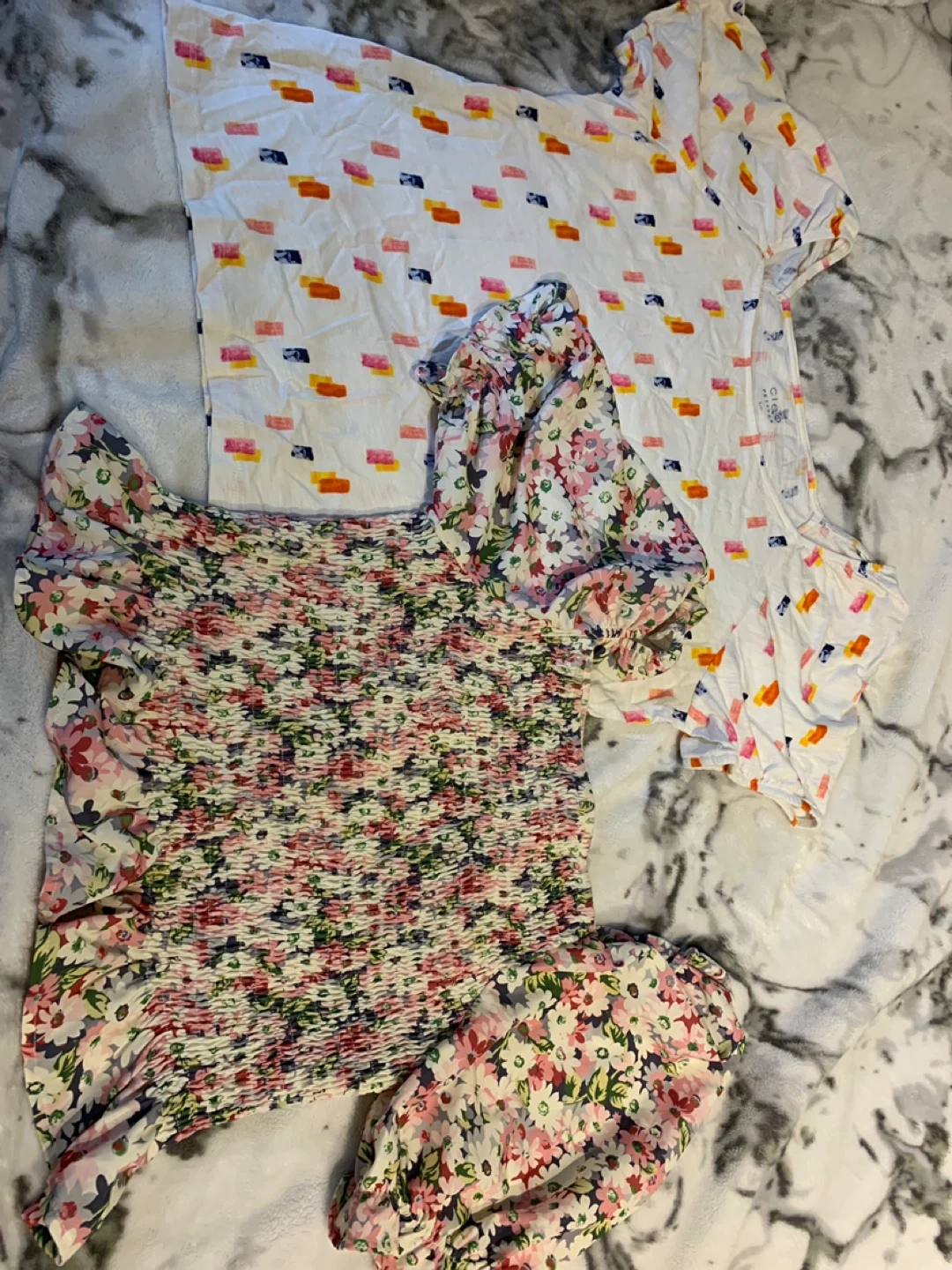Two women's tops from Cleo Petites. Features a white top with colourful stripe brush strokes and a white floral print top with smocked bodice. Great for everyday wear!