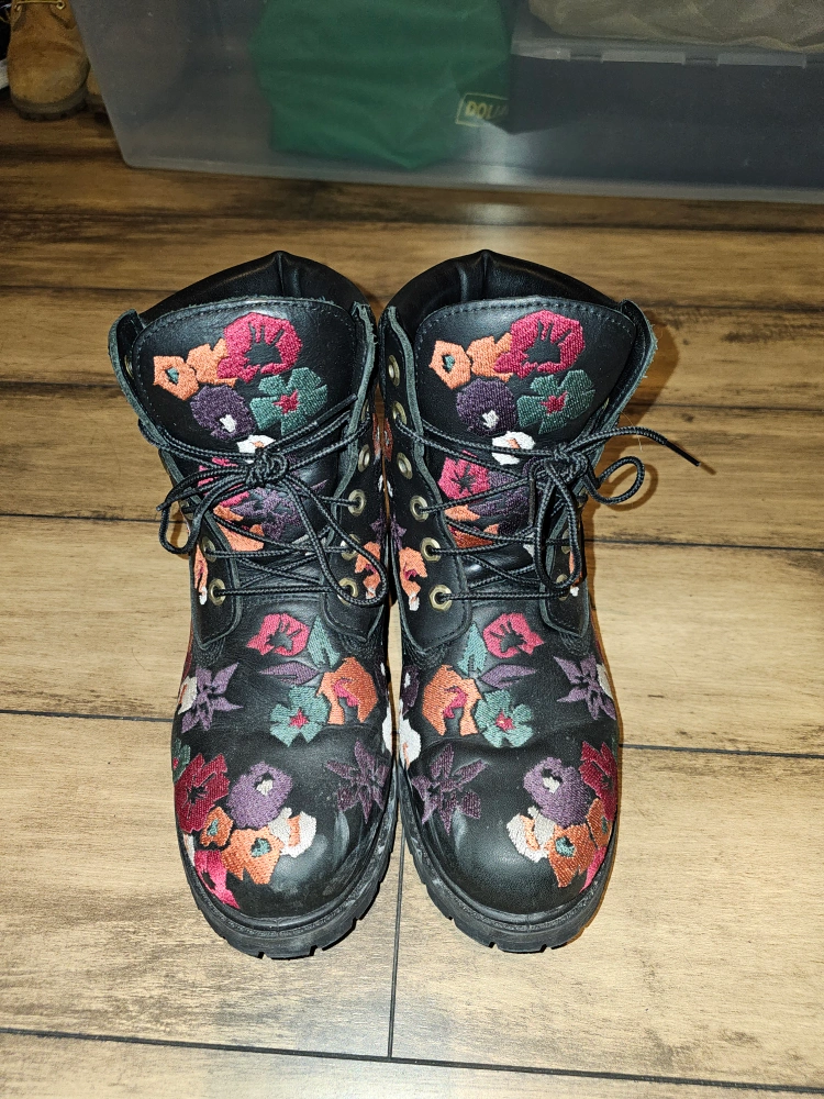 Floral embroidered boots. Black leather. Women's size. Pre-owned. I did not like the fitting (Sorry it does NOT come with a box) Cash Only Meetups Only at Joyce station or metrotown