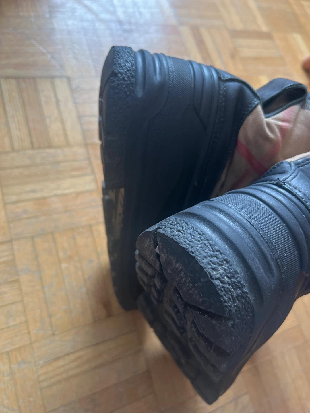 Warm Burberry winter boots with a patterned fabric shaft and rubber lower. Features a cozy faux fur lining for extra warmth. These boots would be great for keeping your feet dry and toasty during colder months!