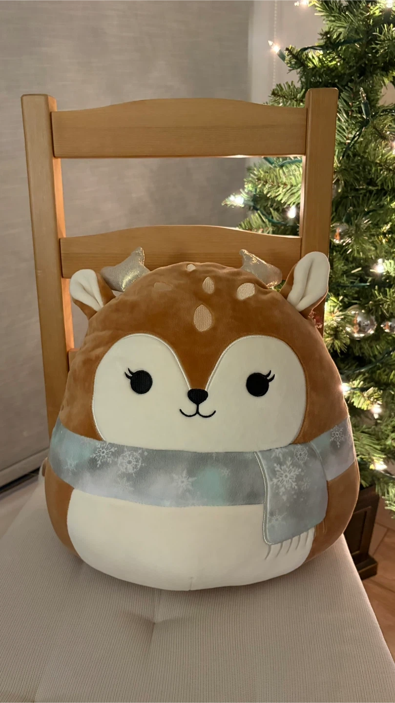 Selling a super cute Squishmallows reindeer plush! It's in great condition and ready to be cuddled. This adorable plushie features a soft, velvety texture and a charming design, complete with a cozy snowflake scarf. Perfect for adding a touch of holiday cheer to any room!