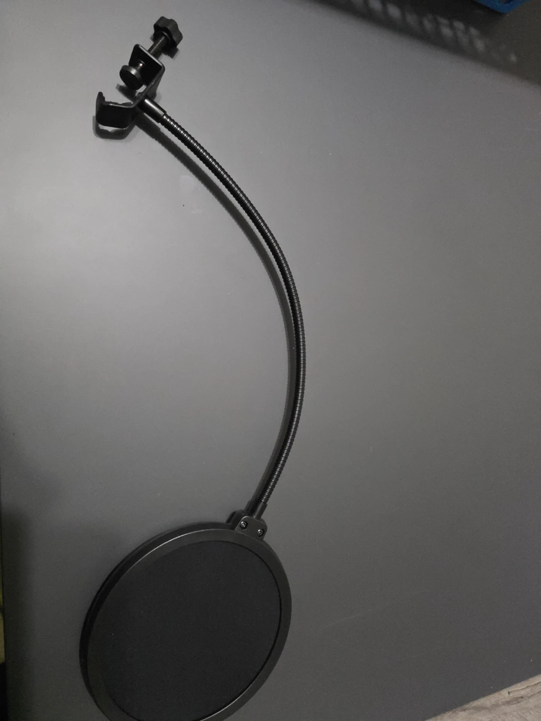 This is a black microphone pop filter. It has a flexible gooseneck arm and a clamp for mounting. The filter disc is round and black.