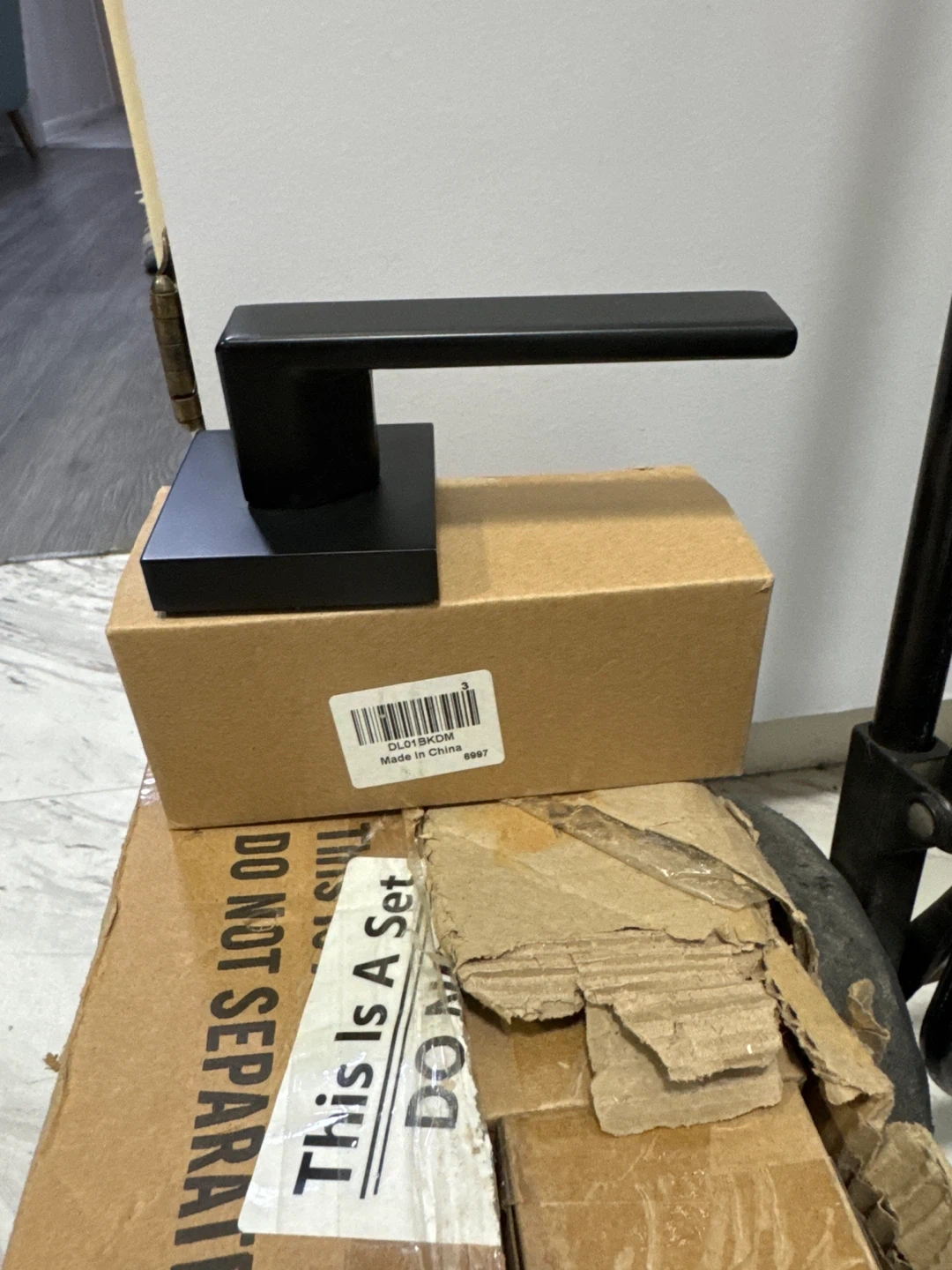 This is a black door lever handle, likely for interior doors. It's a sleek, modern design. Handle is made of metal. Includes original packaging, though it's been opened.
