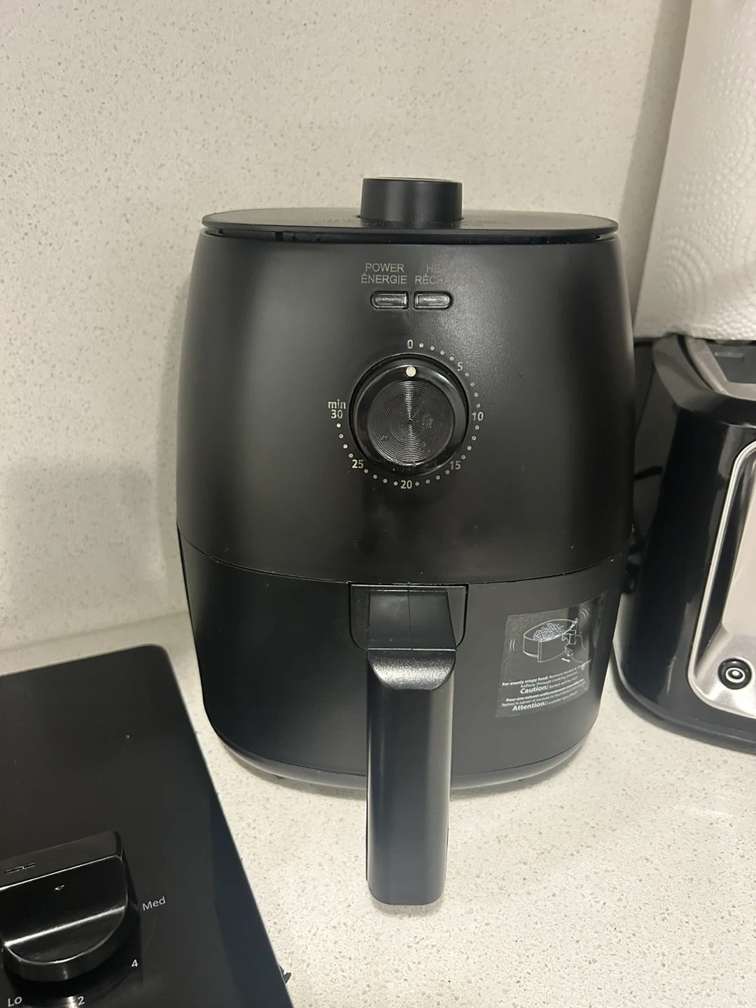 This black air fryer features a mechanical timer that goes up to 30 minutes. It has power and heat indicators. This appliance is great for making crispy foods quickly.