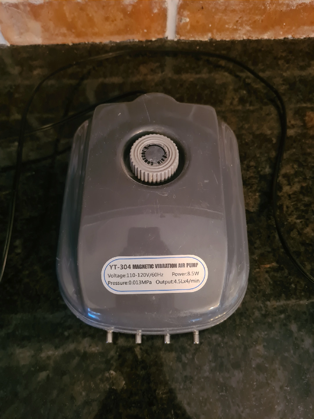 10Selling a YT-304 magnetic vibration air pump. It has a voltage of 110-120V/60Hz, power of 8.5W, a pressure of 0.013MPa, and an output of 4.5Lx4/min Bubbler