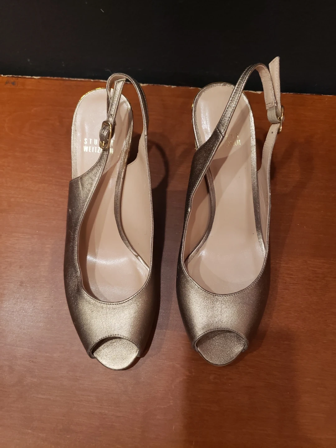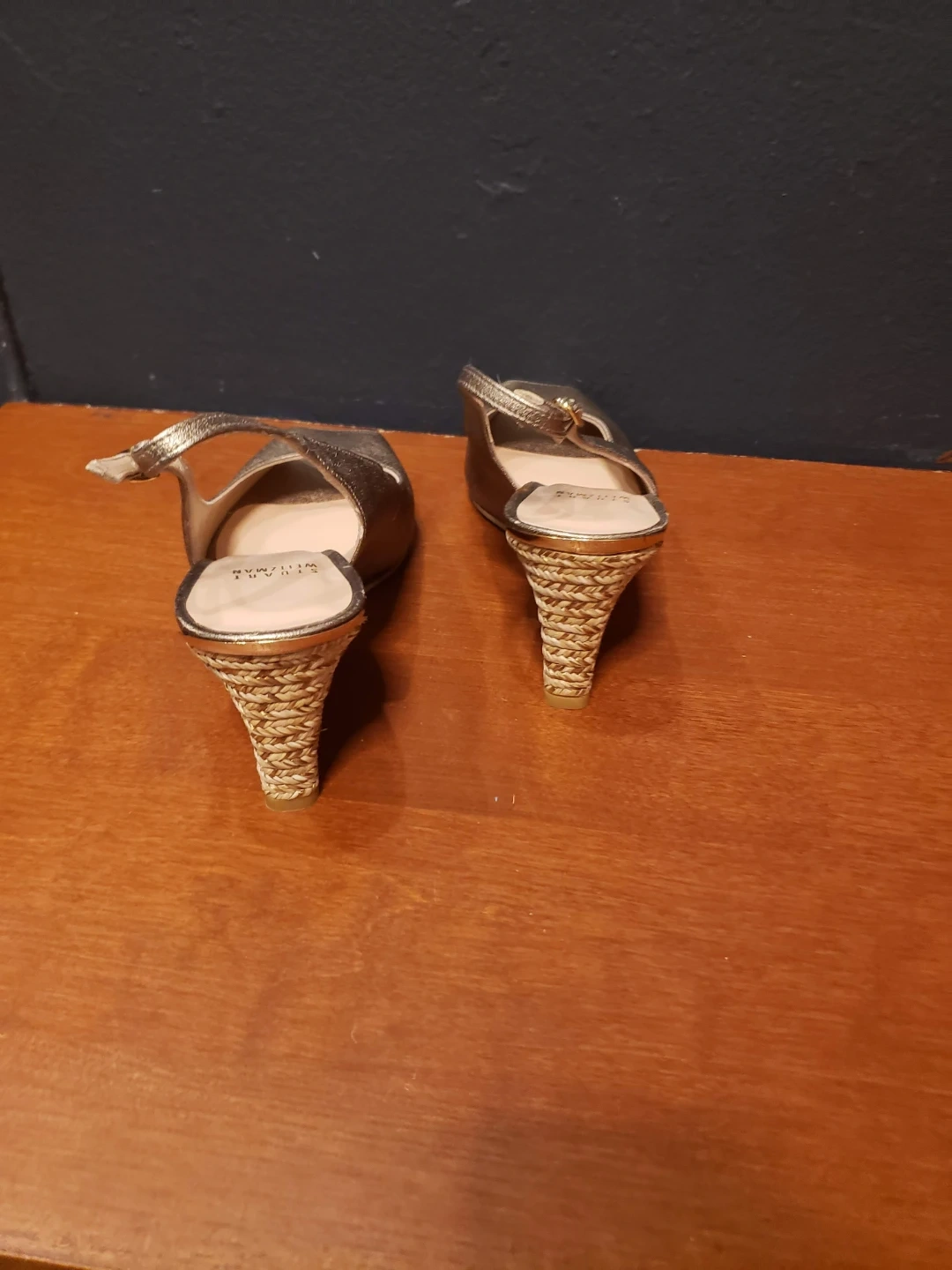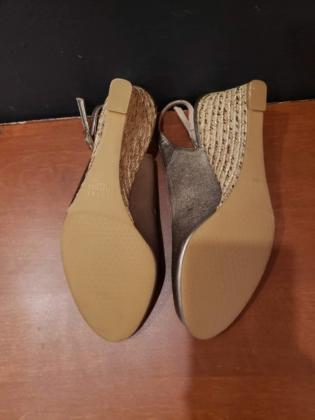 These Stuart Weitzman wedge sandals feature a stylish peep-toe design and a woven wedge heel. The bronze color offers a sophisticated look. Slingback strap with adjustable buckle. Material: Metallic leather and woven raffia.