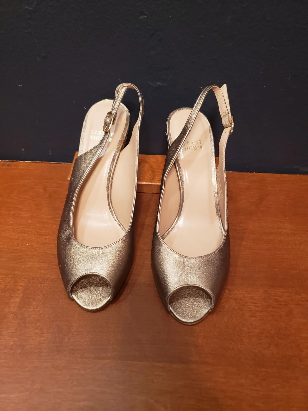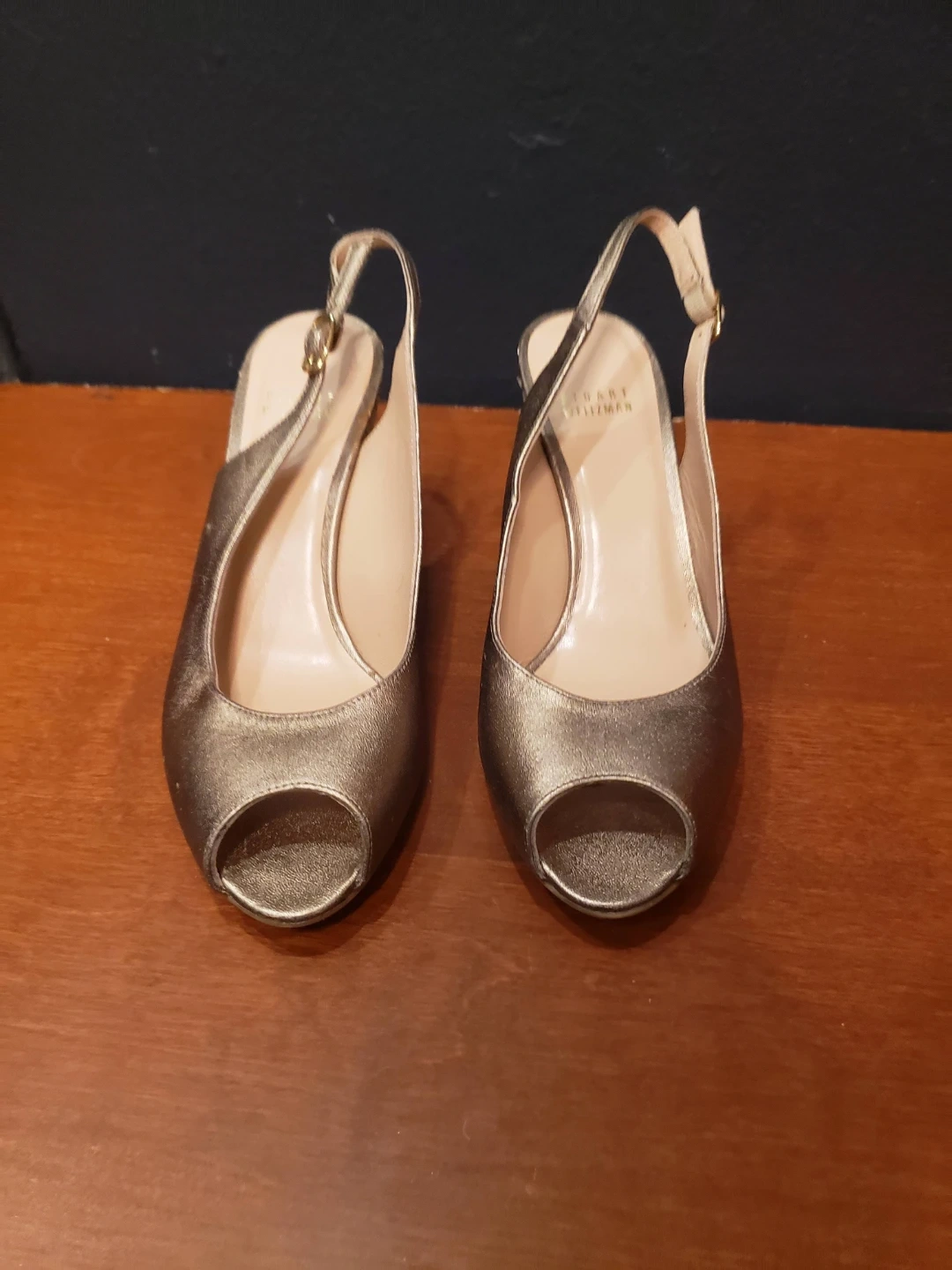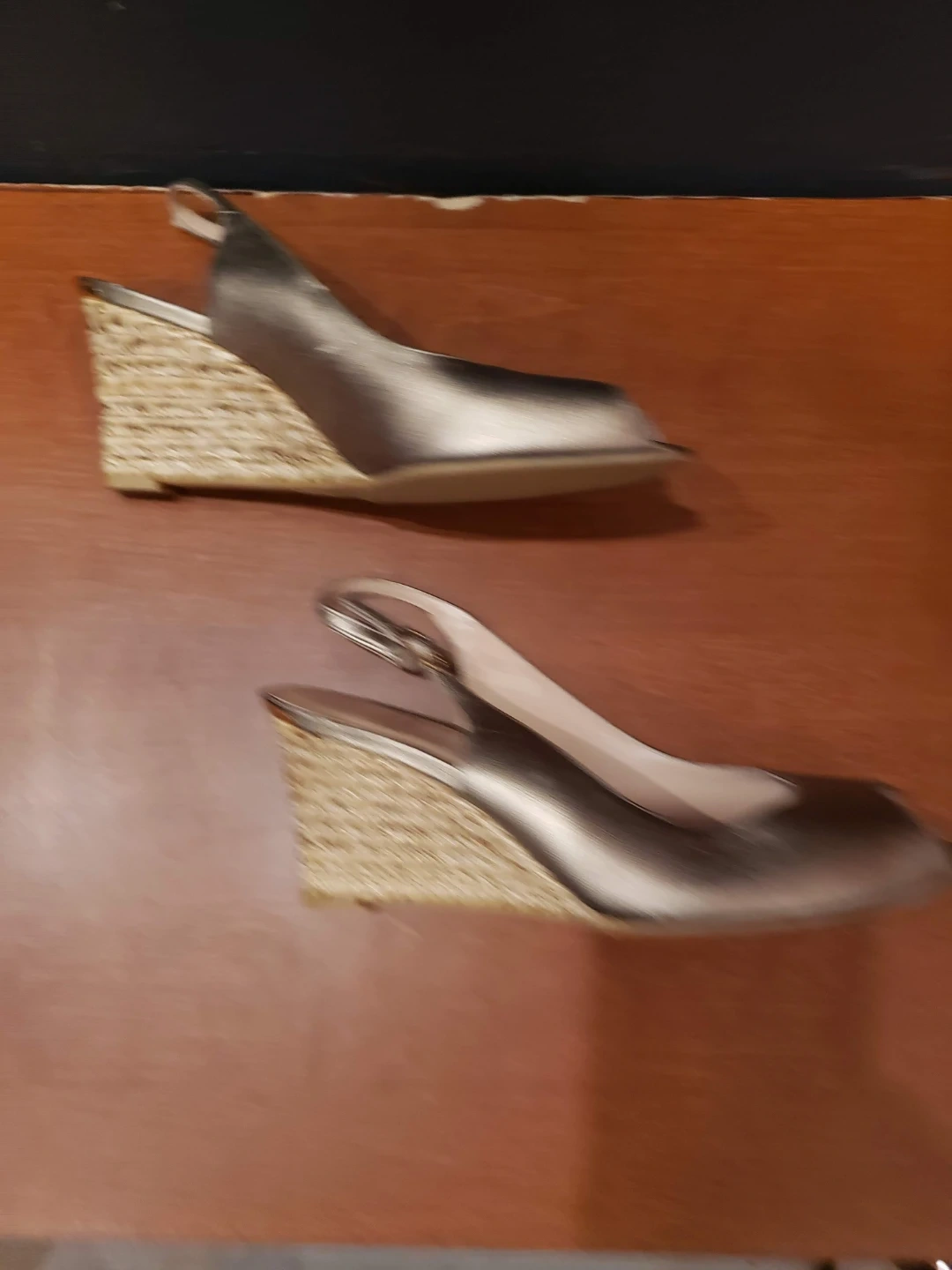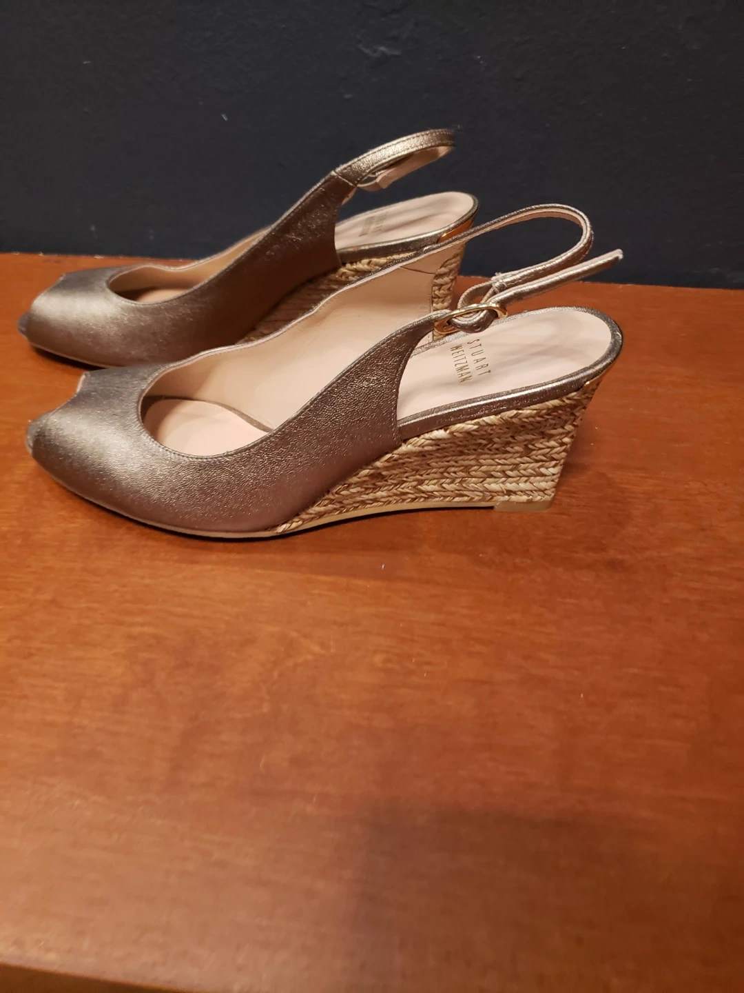 These Stuart Weitzman wedge sandals feature a stylish peep-toe design and a woven wedge heel. The bronze color offers a sophisticated look. Slingback strap with adjustable buckle. Material: Metallic leather and woven raffia.