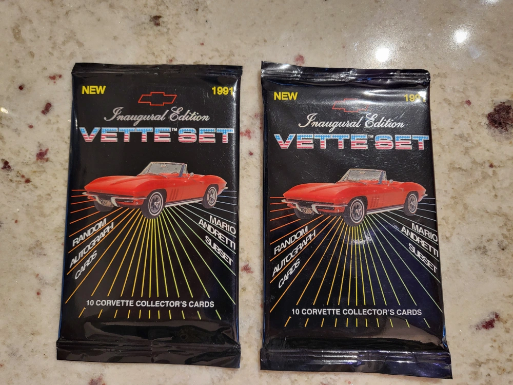 Two unopened packs of 1991 Inaugural Edition Vette Set collector cards. Each pack contains 10 Corvette collector's cards. Features year models, factory photos, production numbers and more. Includes a subset of racing superstars and Mario Andretti. Random autograph cards.