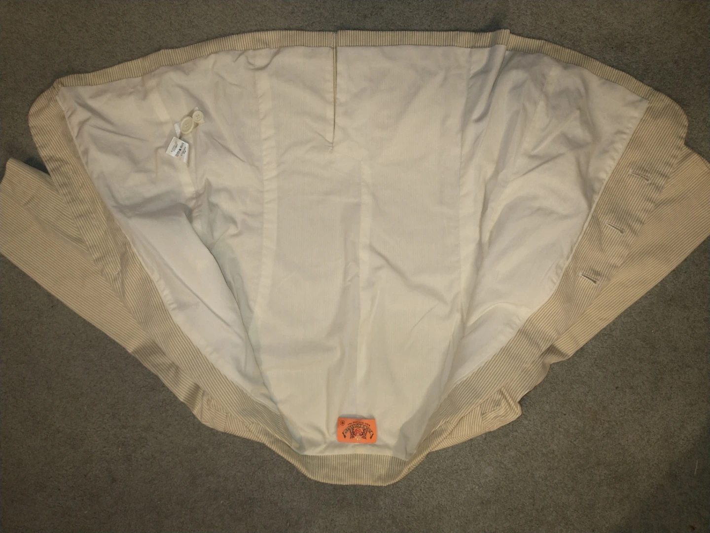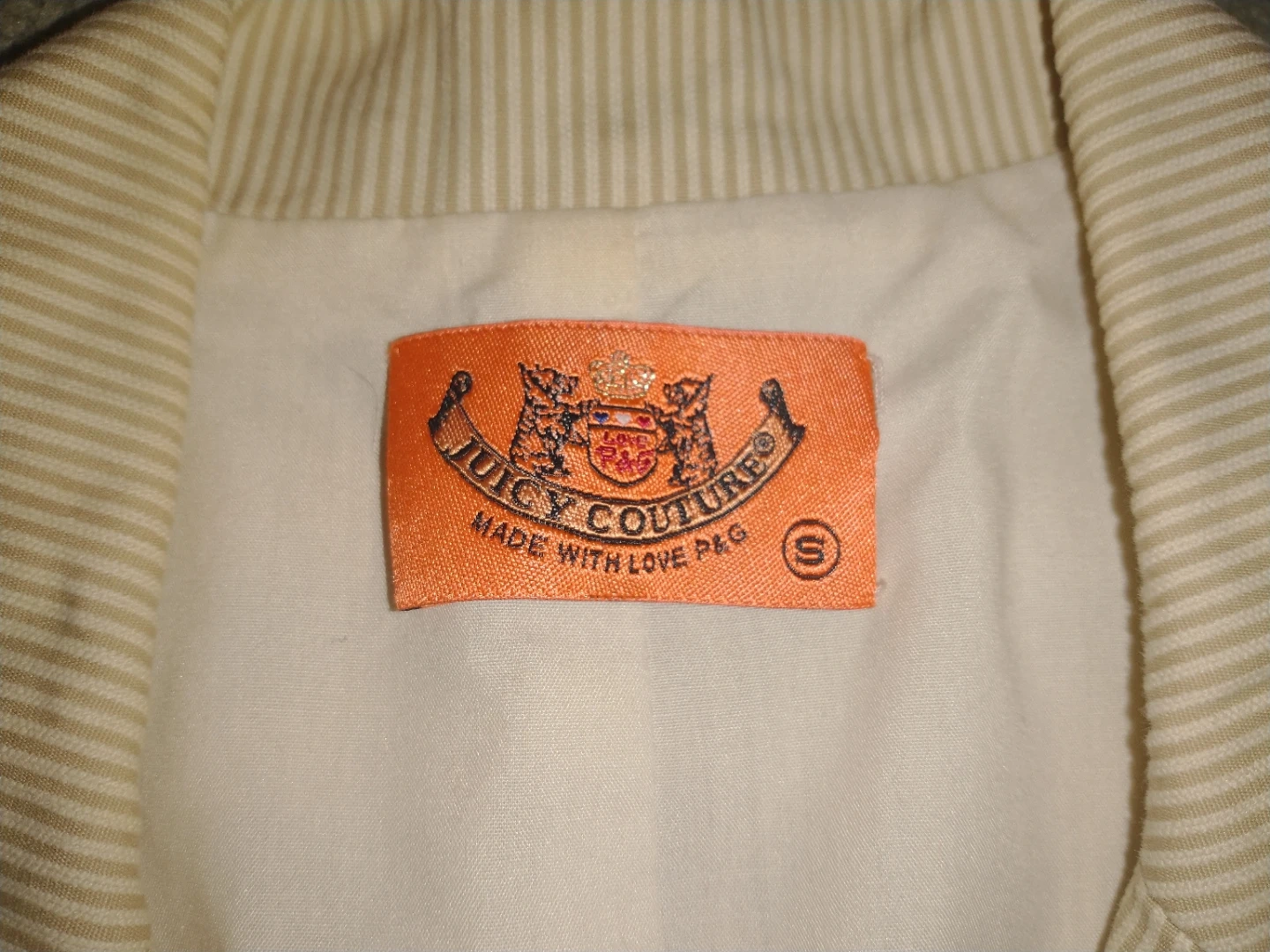 Selling a Juicy Couture blazer in a beige and white striped pattern! It's a size small and in great condition. Perfect for adding a touch of vintage flair to your wardrobe.