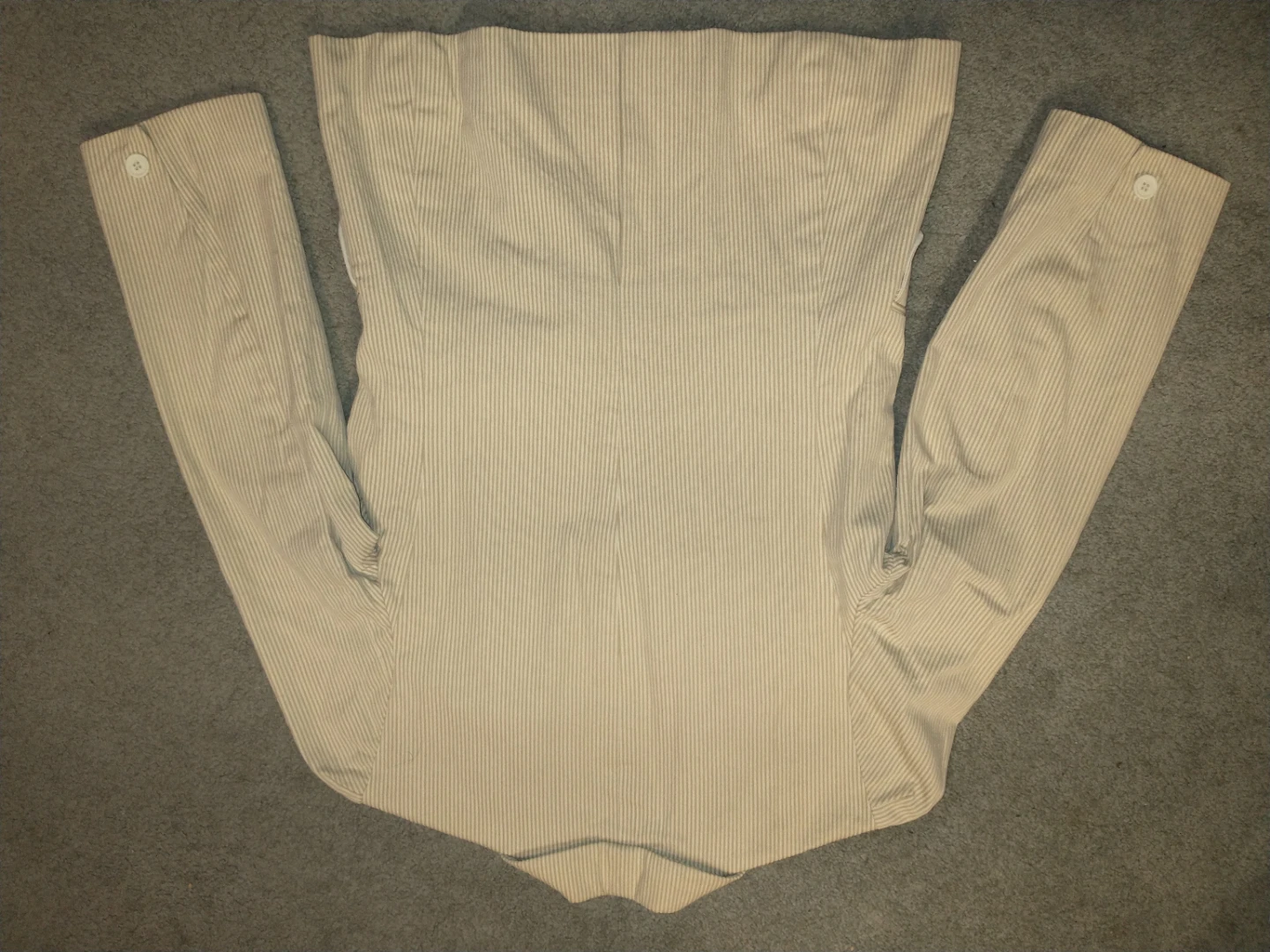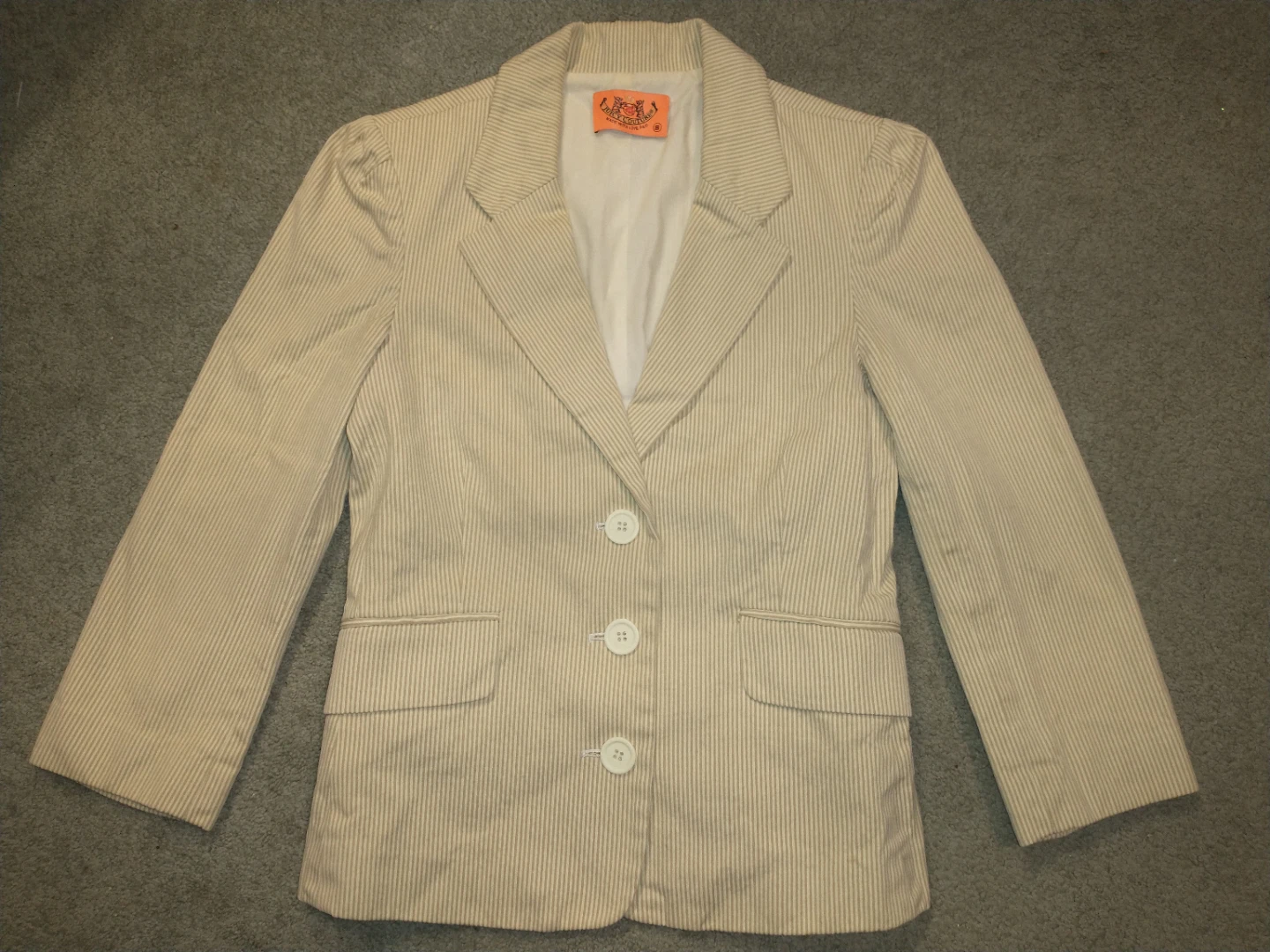 Selling a Juicy Couture blazer in a beige and white striped pattern! It's a size small and in great condition. Perfect for adding a touch of vintage flair to your wardrobe.