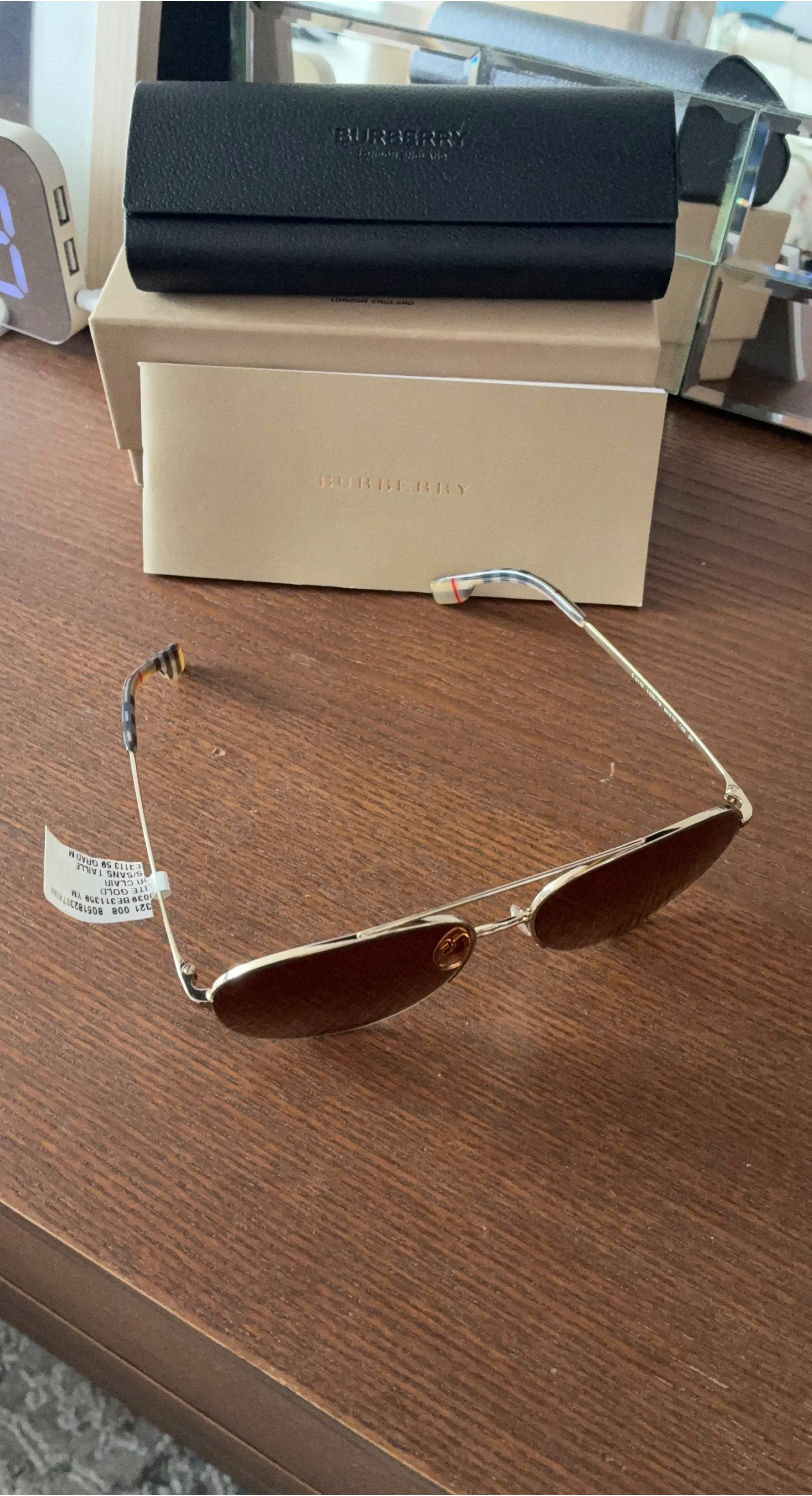 Burberry aviator sunglasses in a gold finish. They come with the original case, cleaning cloth, and documentation.