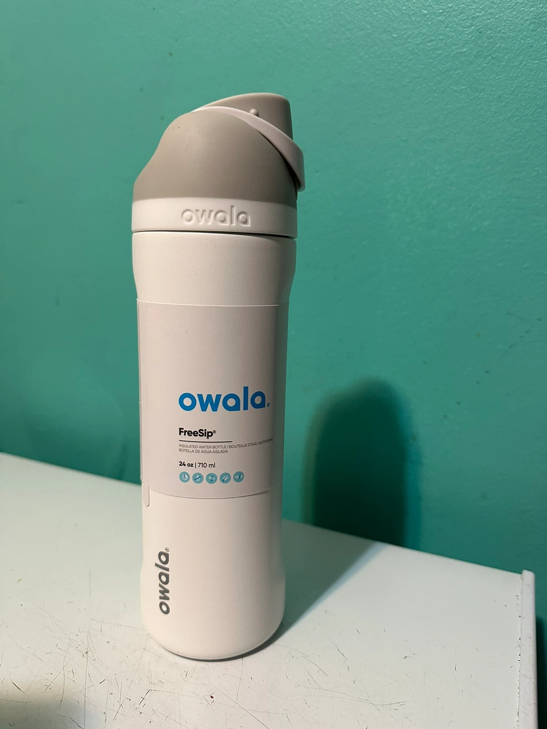 This is an Owala FreeSip insulated water bottle. It's 24 oz or 710 ml. The bottle is white with a grey lid. This is great for staying hydrated throughout the day!