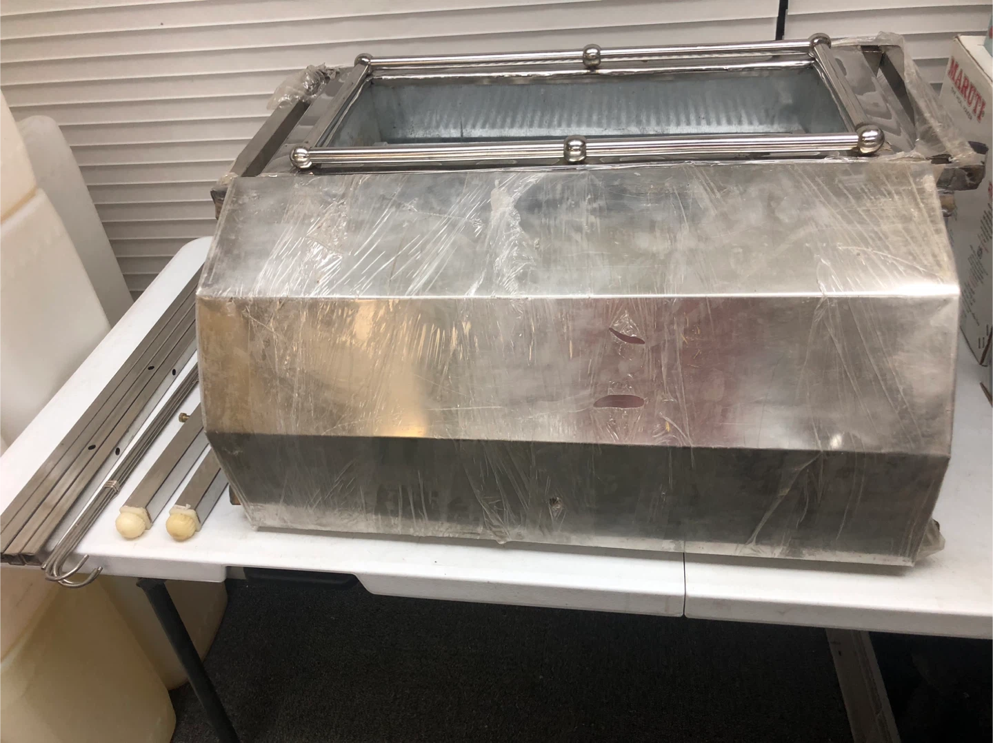 This stainless steel rotisserie grill is perfect for outdoor cooking. It comes with legs and other accessories for setup. Some parts are still in original packaging.