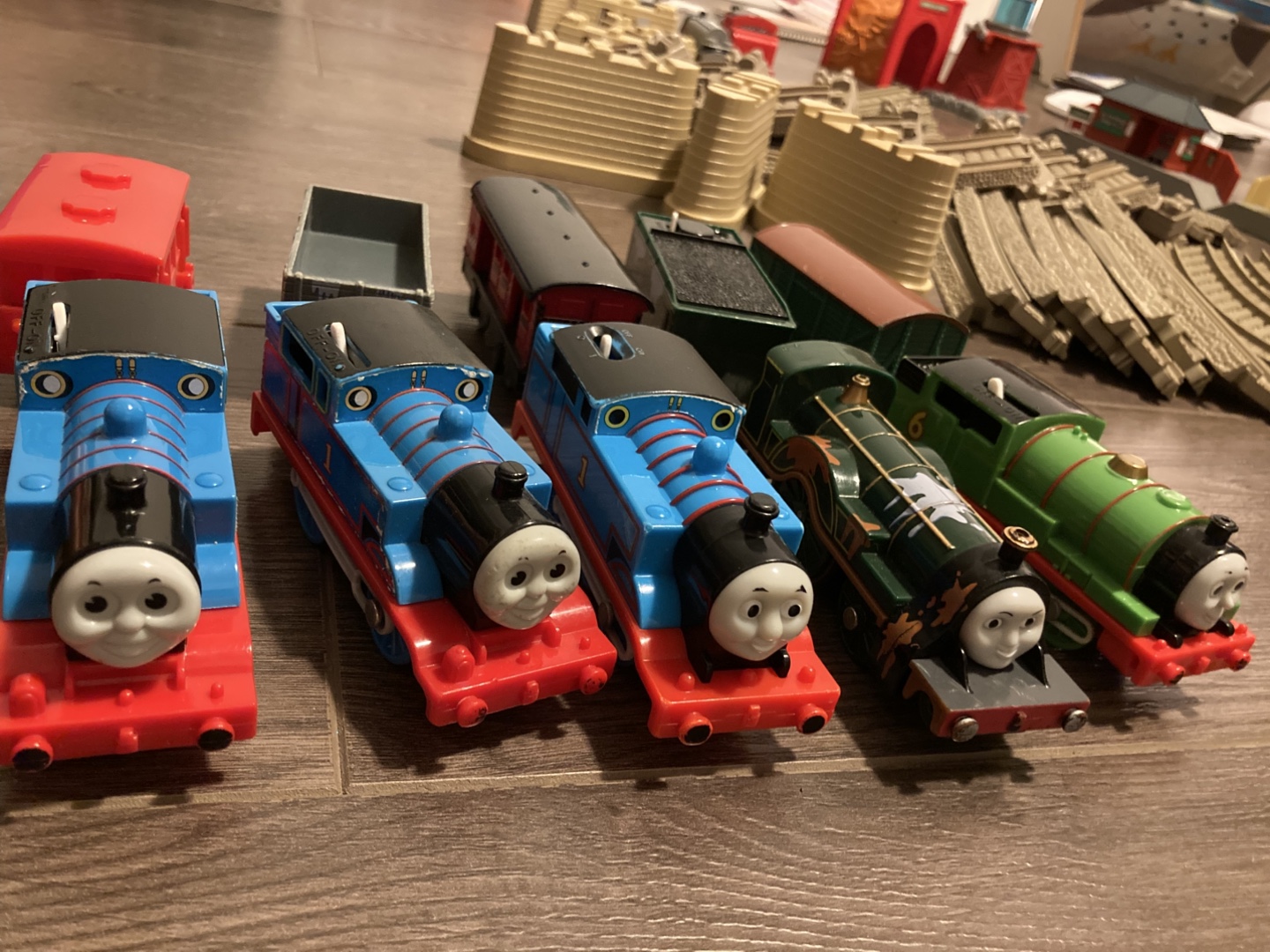 Selling a Thomas & Friends train set, complete with multiple train cars and lots of track pieces! Good for little kids who love to play with trains!