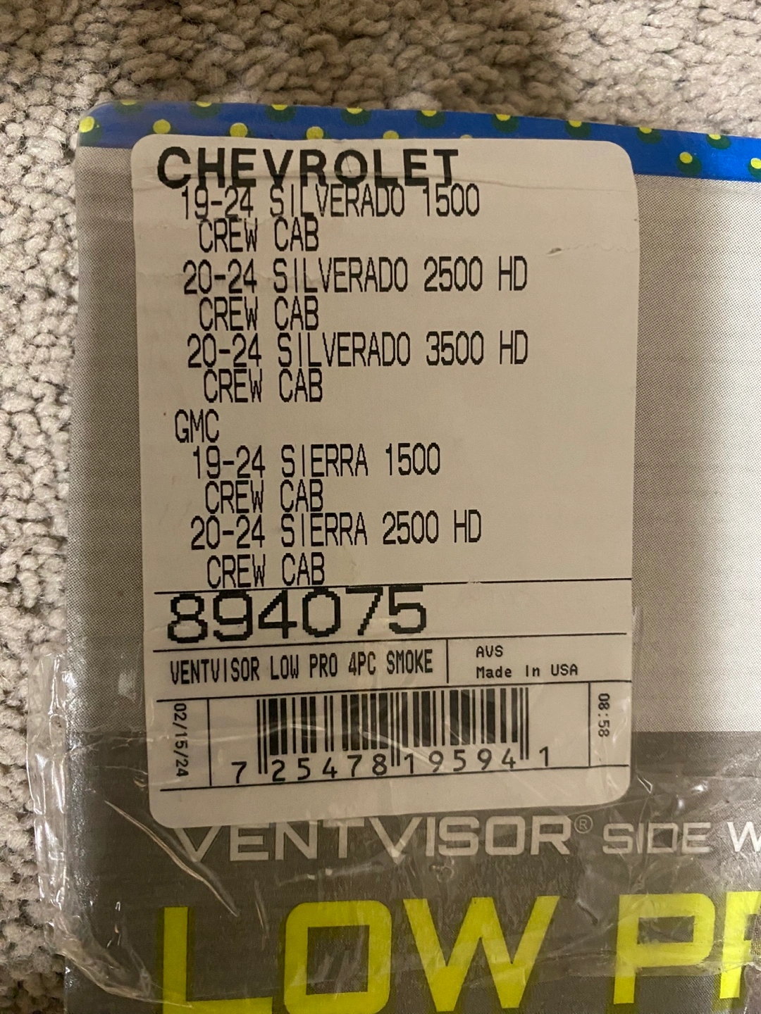 New in box. Set of four smoked window deflectors. Fits 19-24 Chevrolet Silverado 1500, 2500 HD, 3500 HD Crew Cab and 19-24 GMC Sierra 1500, 2500 HD Crew Cab.
