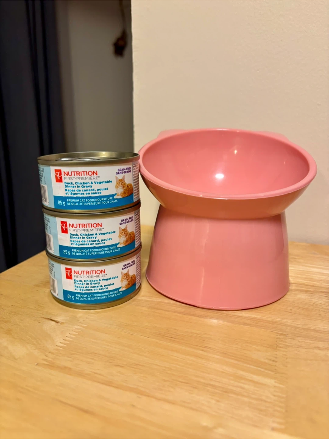 3 x 85g cans of President’s Choice Nutrition First Duck, Chicken, and Vegetable Dinner in Gravy Premium Cat Food with a standing tilted bowl included. Expiry dates in last photo.