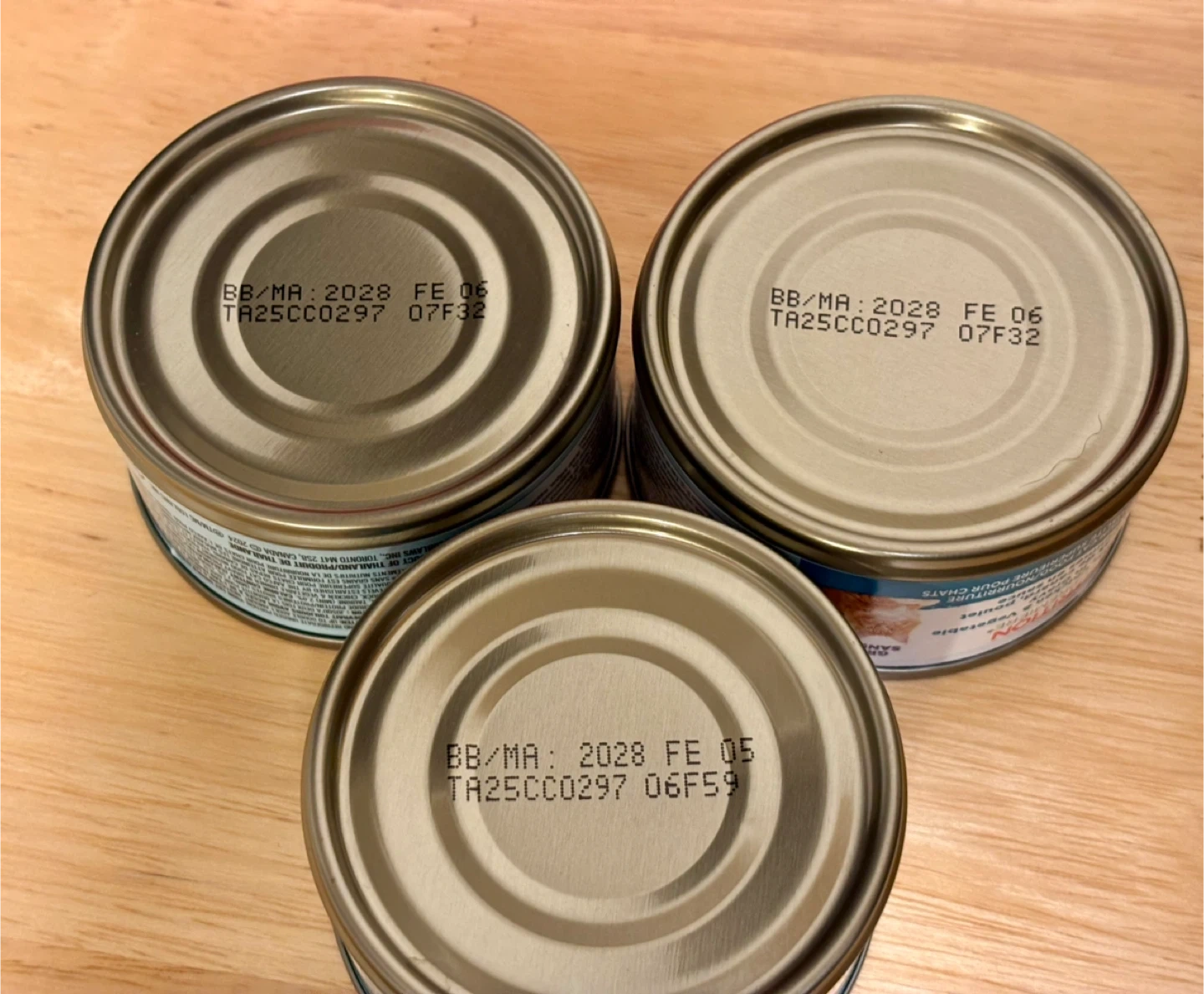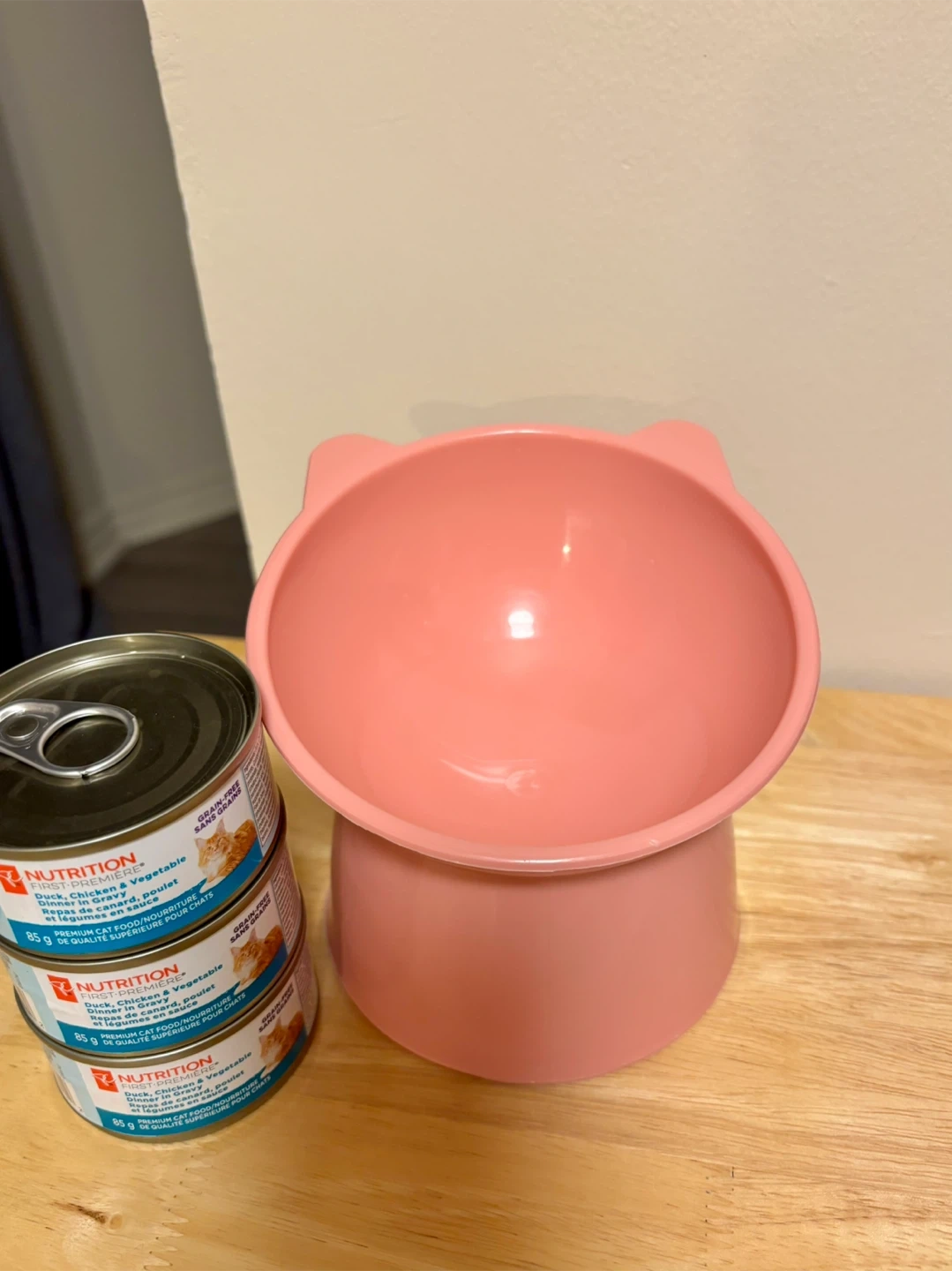 3 x 85g cans of President’s Choice Nutrition First Duck, Chicken, and Vegetable Dinner in Gravy Premium Cat Food with a standing tilted bowl included. Expiry dates in last photo.