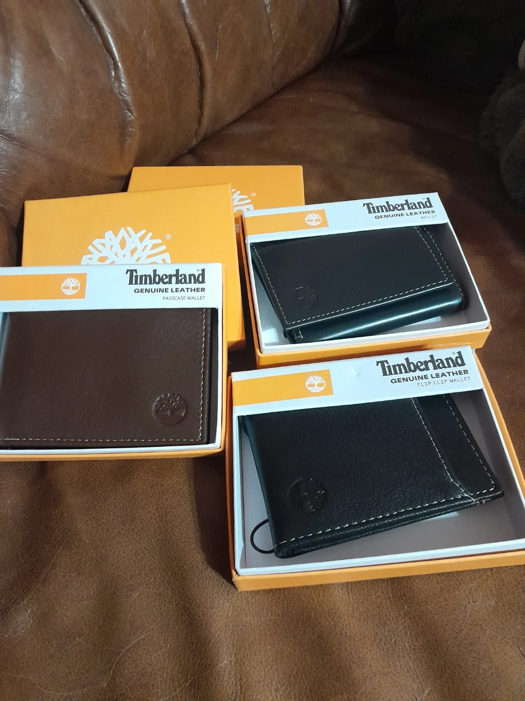Selling three Timberland genuine leather wallets, two black and one brown. Each wallet is new in its original box and features classic stitching. They're made of durable leather. Flip clip card wallet, bi fold, tri fold brand new with tags and box your choice $10.00 each