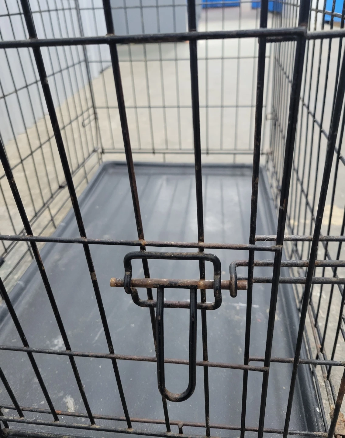 Wire dog crate with a plastic tray. It's a foldable design for easy storage. Features a latching door. There is a small crack on the plastic tray and some signs of rust.