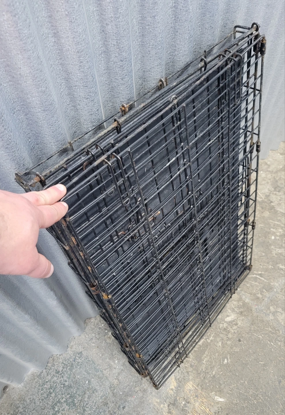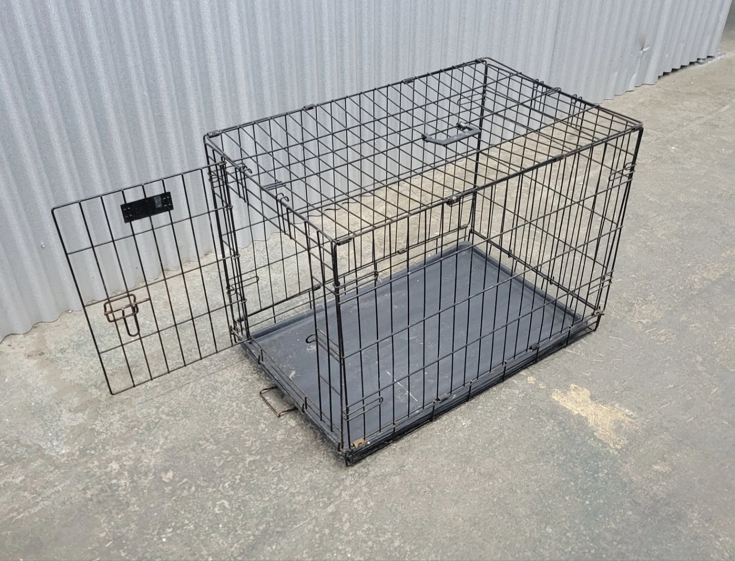 Wire dog crate with a plastic tray. It's a foldable design for easy storage. Features a latching door. There is a small crack on the plastic tray and some signs of rust.