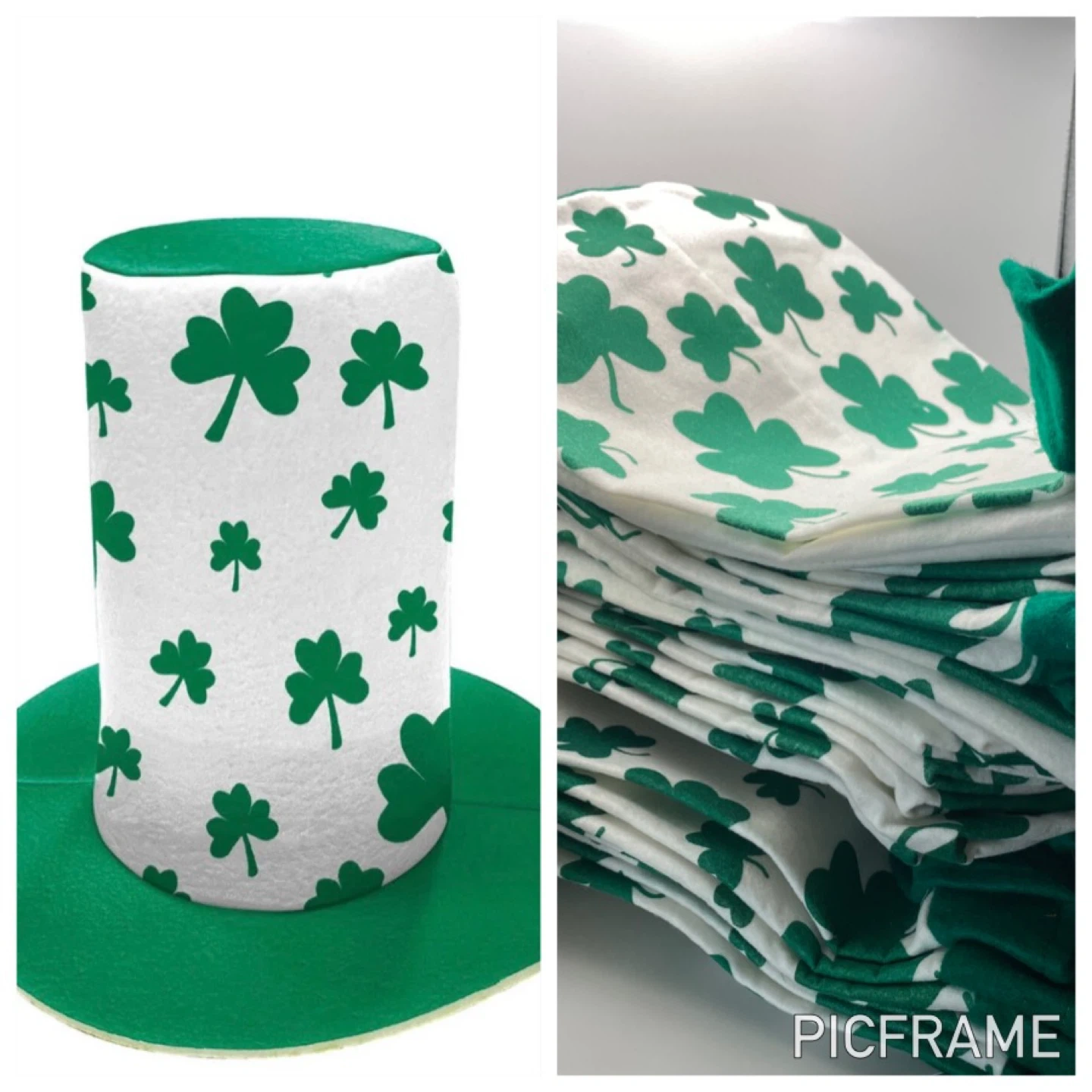 Also available, a stack of green and white shamrock-patterned cloth top hats.