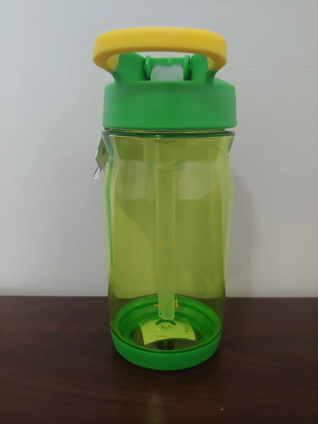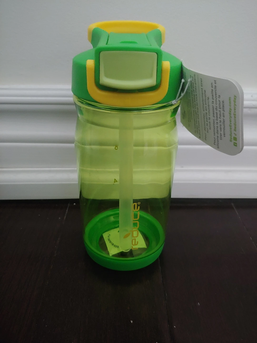 New Reduce Hydrate 14 oz bottle with a leakproof lid and spill-proof straw. It's great for kids ages 3 and up. The bottle is made of plastic.
