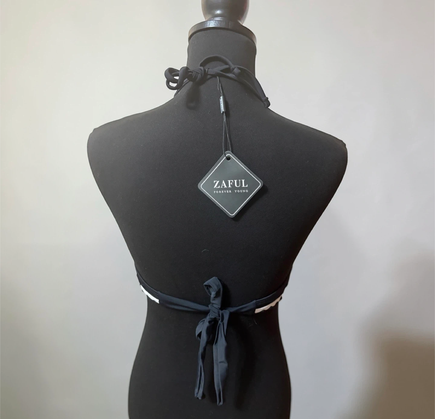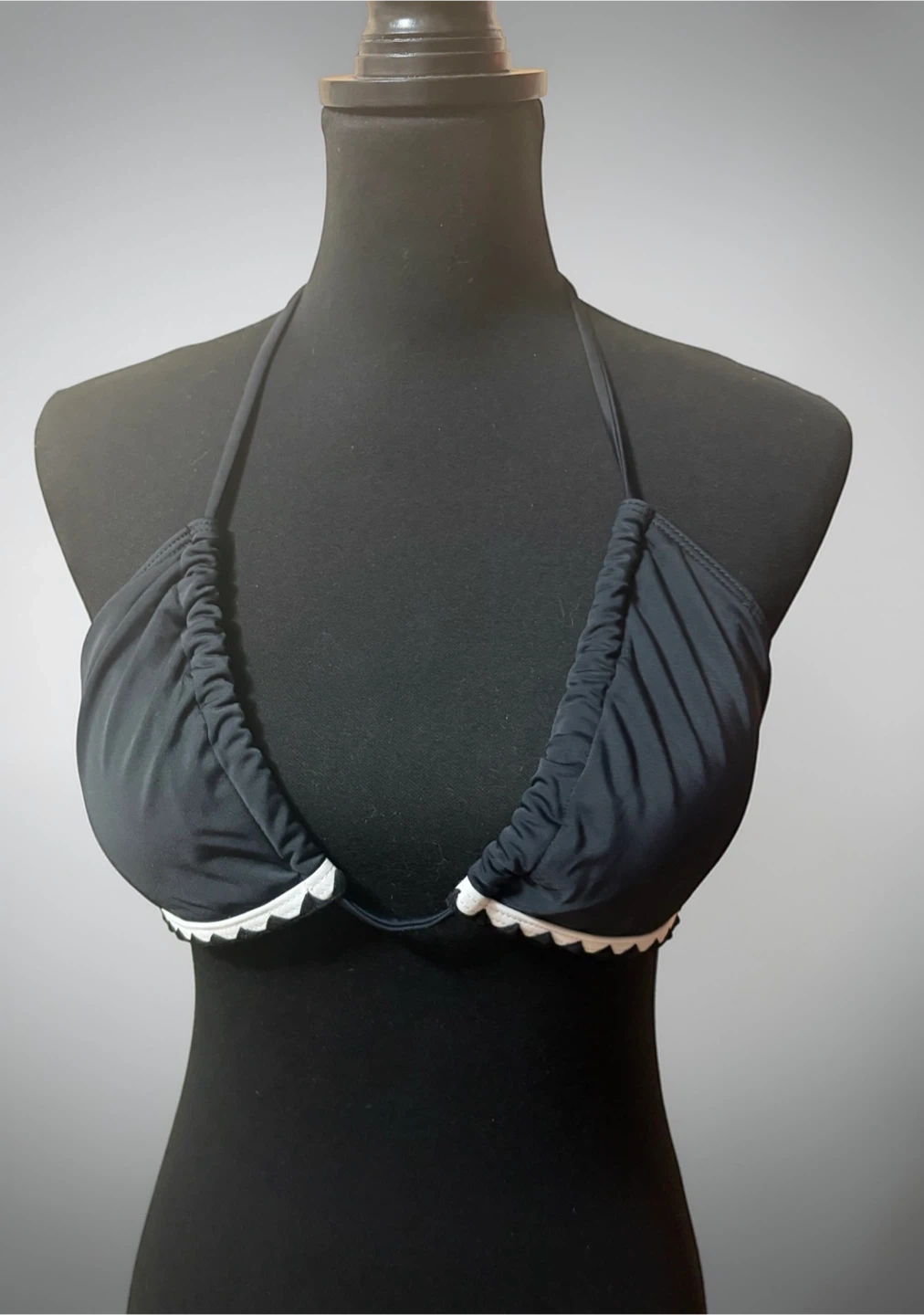 This black halter bikini top features a white trim along the cups and ties. It's made with 87% nylon and 13% spandex. Perfect for your next beach vacation!