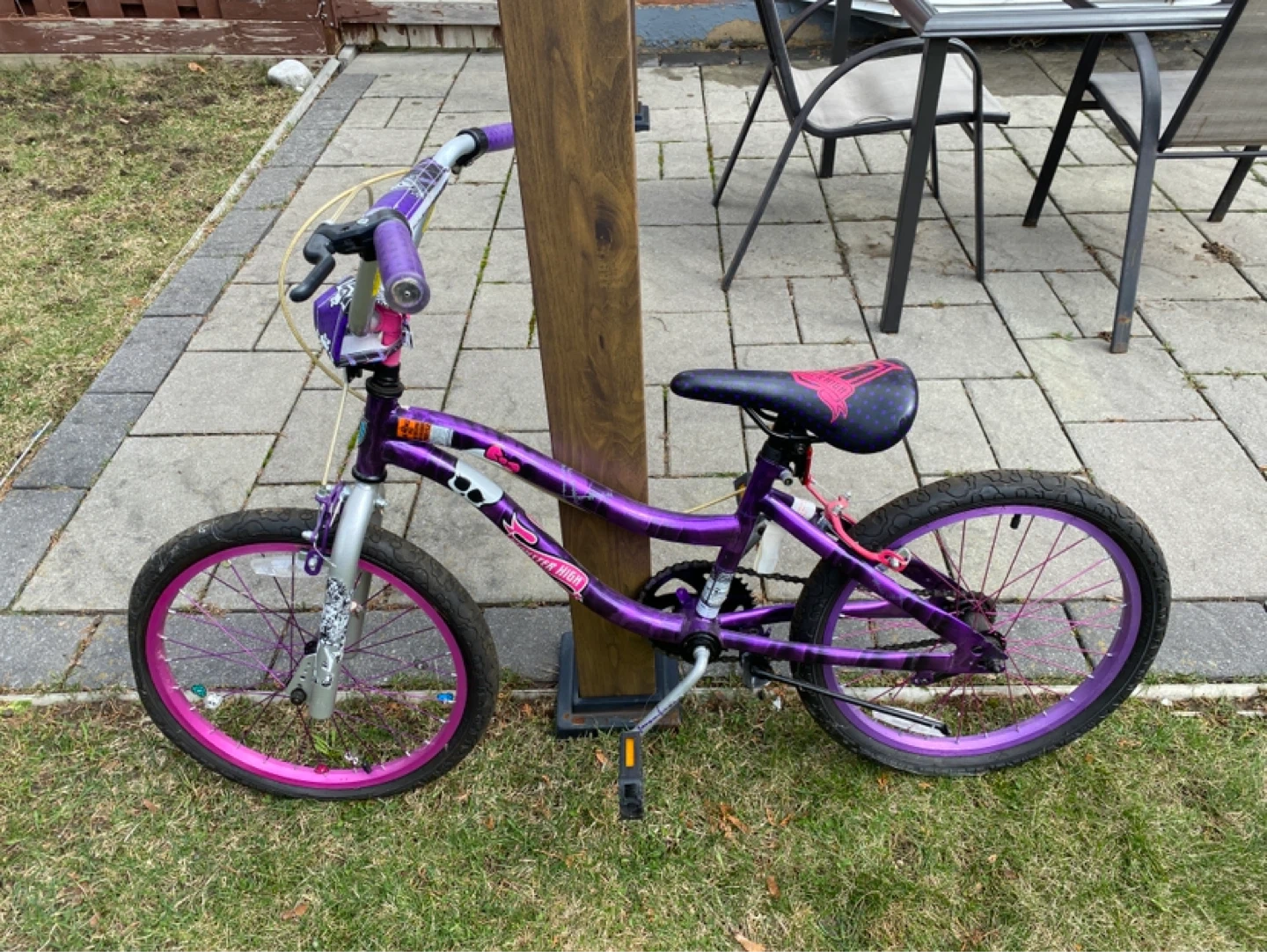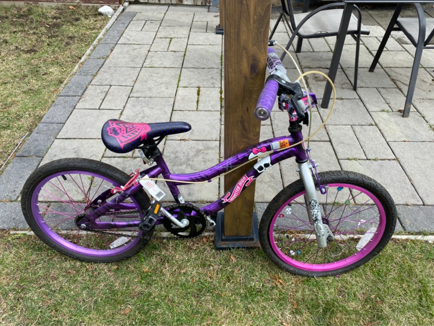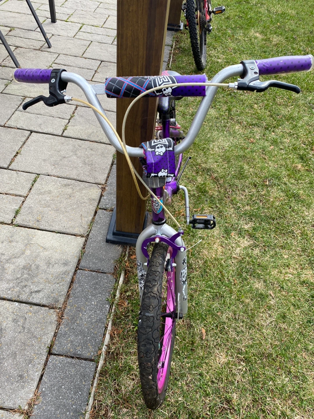 Front tire tube needs replacement. Purple Monster High kids bicycle. Features a durable frame and comfortable seat. Ideal for young riders learning to cycle!