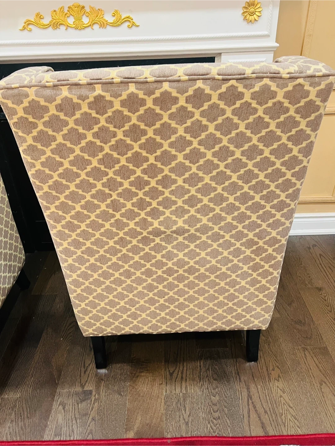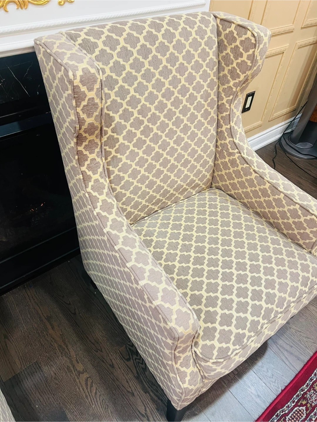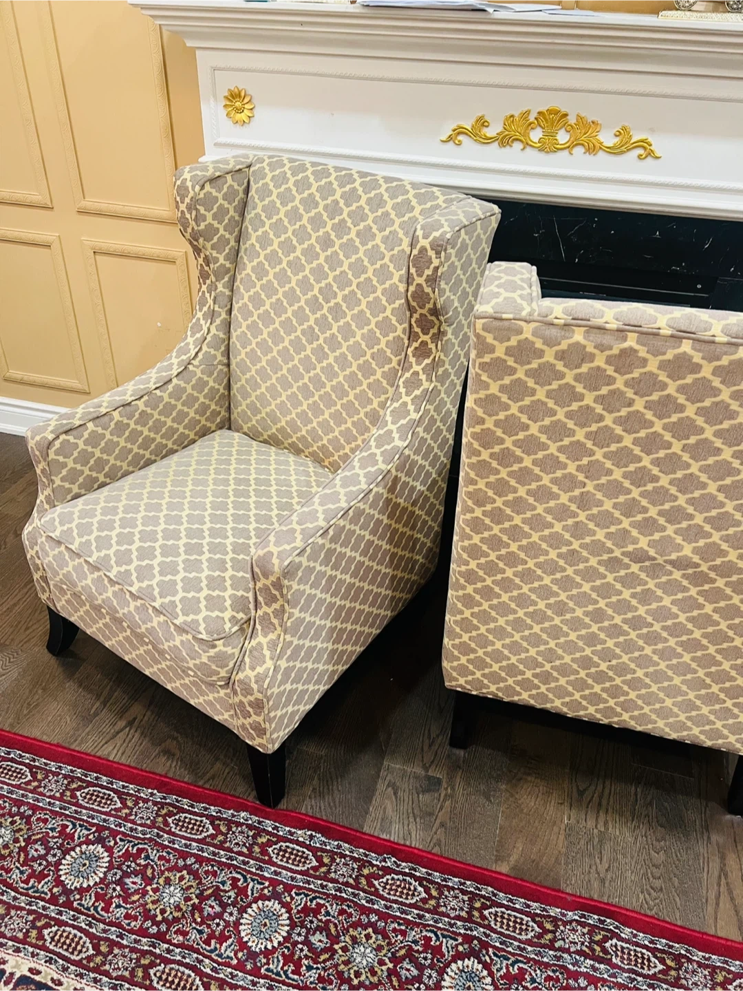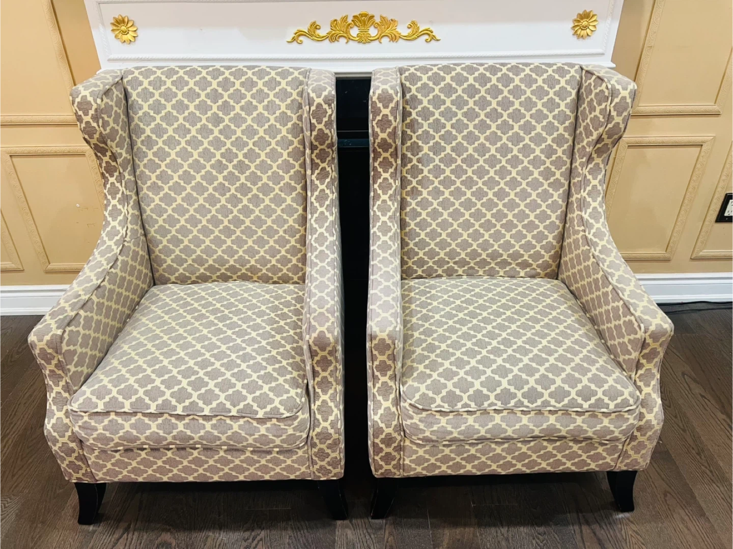 A pair of stylish accent chairs with a grey and beige geometric pattern. These wingback chairs offer a comfortable seating option. Upholstered in fabric with dark wooden legs.