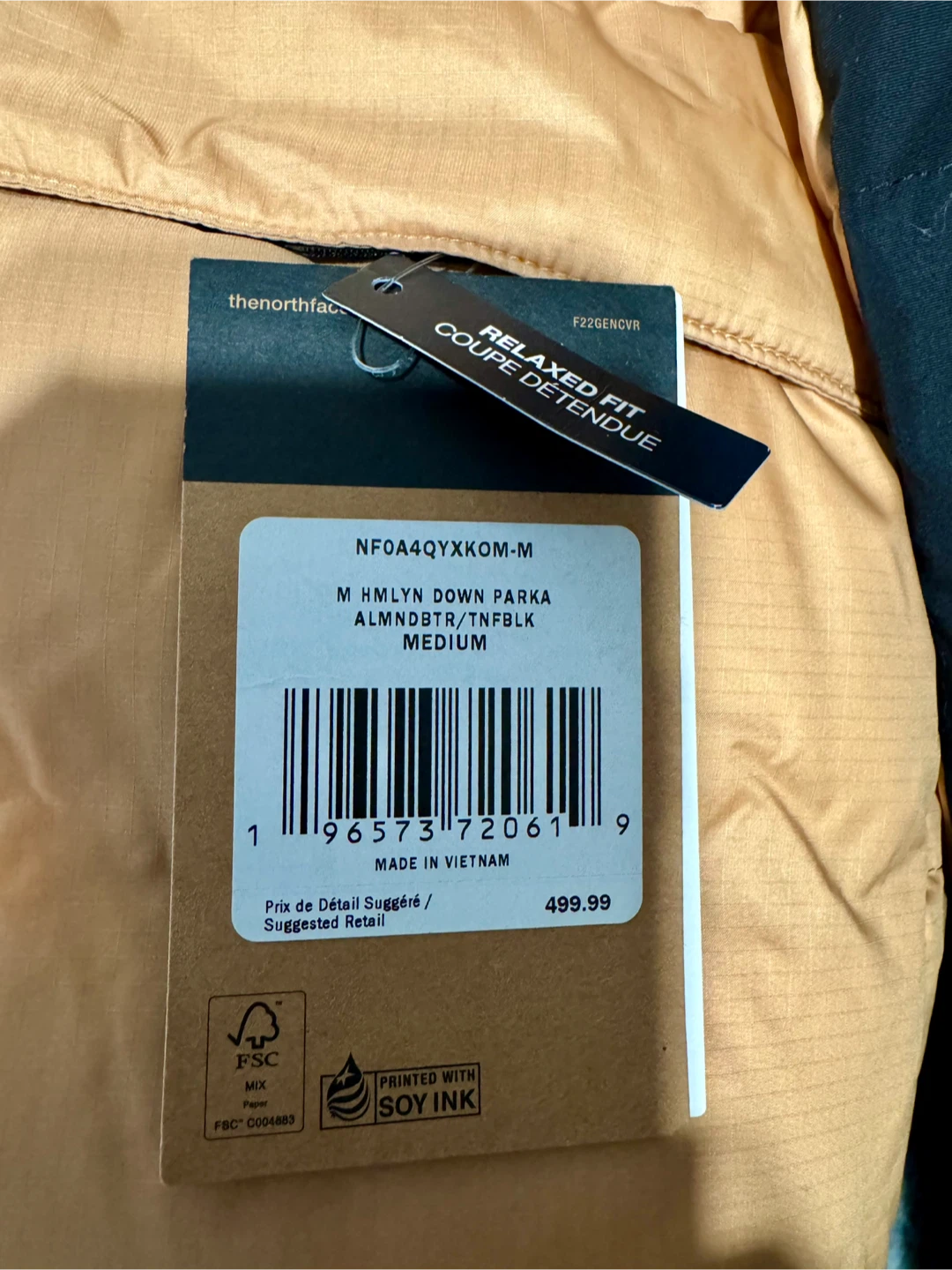 Selling a Brand New with Tag The North Face HM LYN Down Parka in size medium. Almond butter color. It’s a relaxed fit and features 550 fill power down insulation. Originally retailed for $499.99. This unworn brand new priced almost half. Need gone asap. For pick up and cash only..