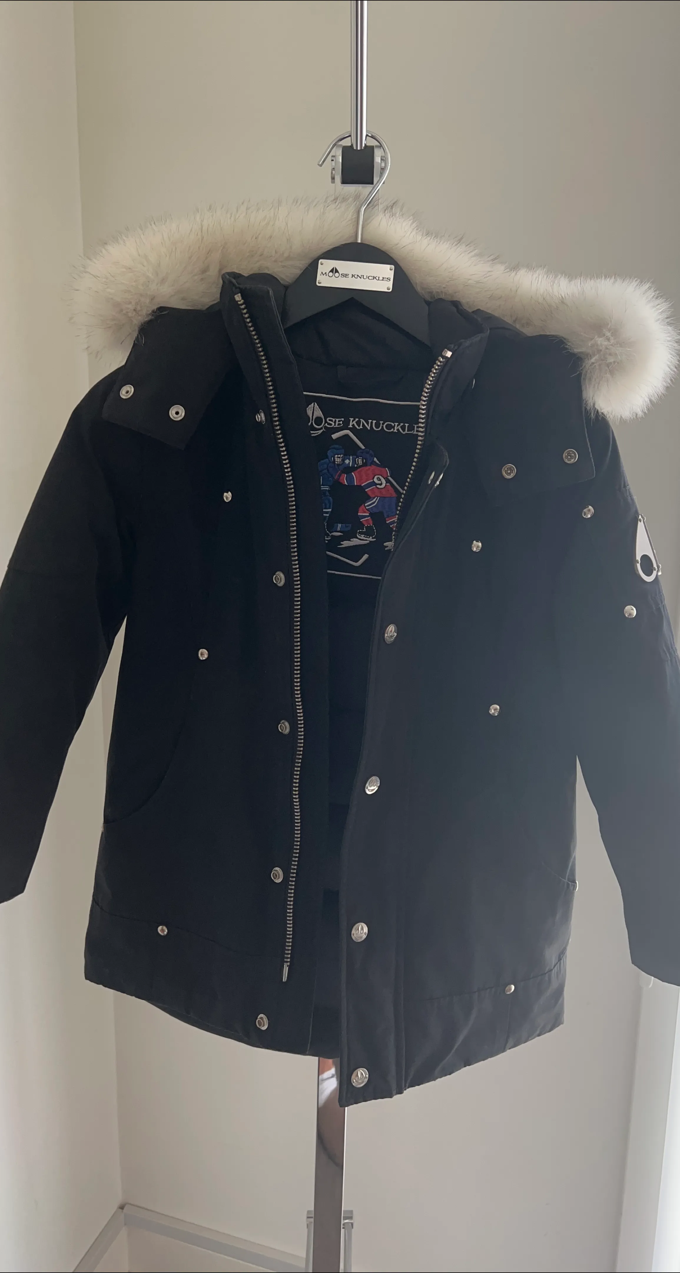 Selling a stylish black Moose Knuckles jacket. Size Kids XS It's in great condition and ready to keep your kid warm this winter! The jacket features a fur-trimmed removable hood and the iconic Moose Knuckles logo on the sleeve.