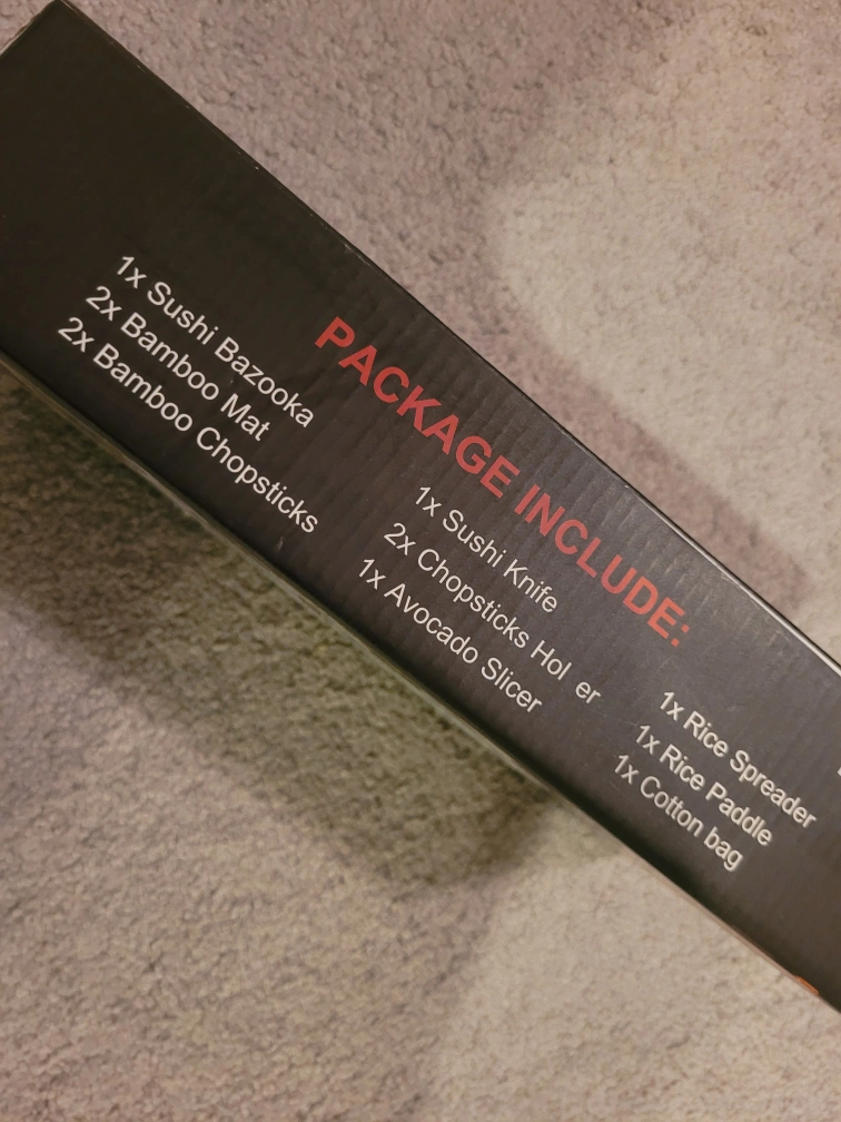 New sushi bazooka kit. Includes: sushi knife, chopsticks holder, avocado slicer, rice spreader, rice paddle, cotton bag, 2 bamboo chopsticks, and a sushi mat.