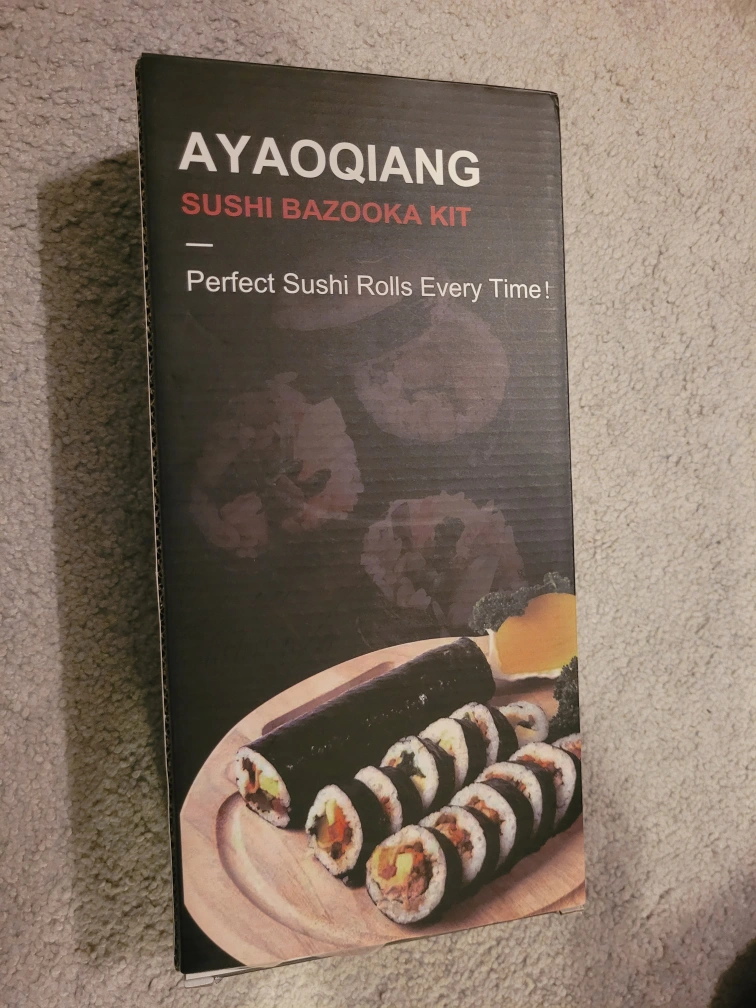 New sushi bazooka kit. Includes: sushi knife, chopsticks holder, avocado slicer, rice spreader, rice paddle, cotton bag, 2 bamboo chopsticks, and a sushi mat.