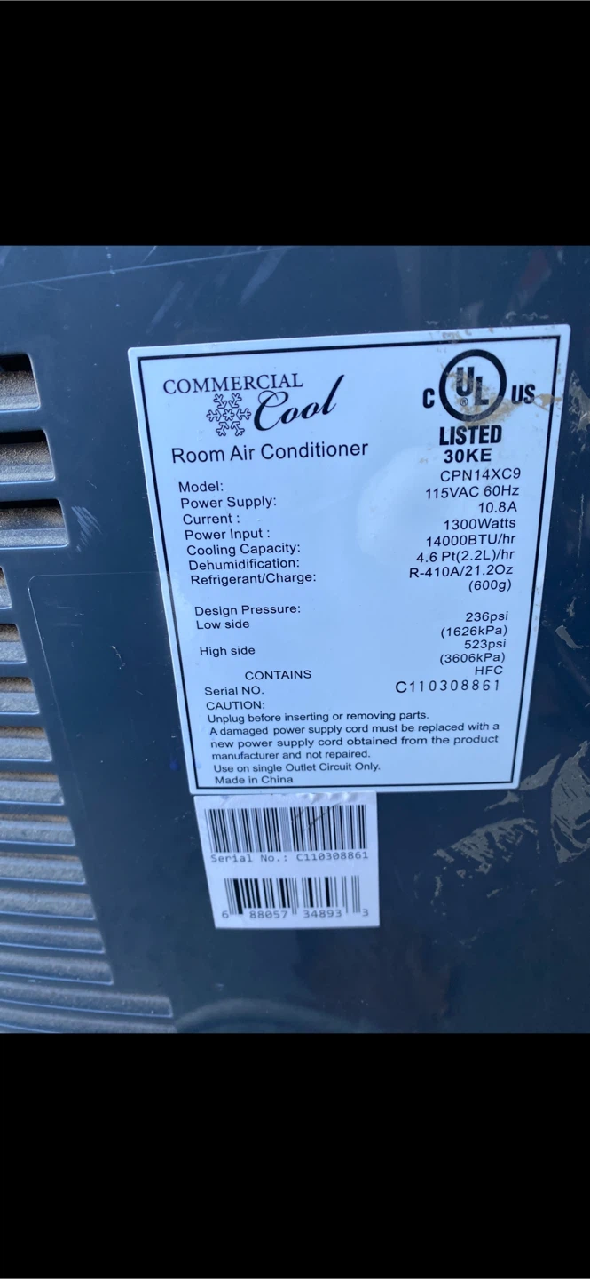 Commercial Cool room air conditioner. It has a cooling capacity of 12000 BTU/hr and dehumidifies at 4.6 pints/hr. It uses R-410A refrigerant and has a eco-friendly design. This unit runs on 115VAC power.