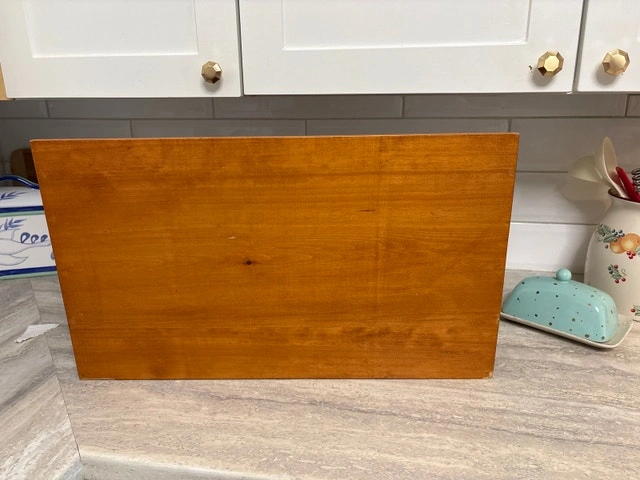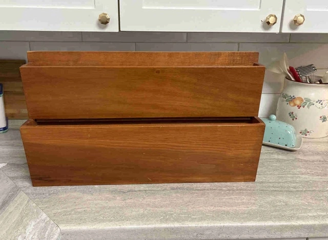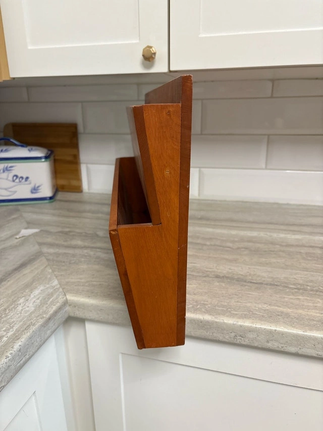 This is a used two-tier magazine rack crafted from solid wood, perfect for organizing your favorite periodicals with a touch of vintage charm. Being a used item, it has some signs of wear, which only adds to its character. This magazine rack is ready to bring order and style to your living space, den, or study. It can be used on a kitchen counter for cookbooks or cutting boards, or hung on the wall. Cash accepted.