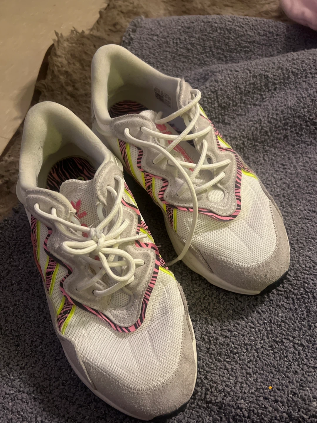 Adidas Ozweego sneakers in white with pink and yellow zebra accents. Made in China. US size 9 1/2. These shoes offer a comfortable fit for everyday wear.
