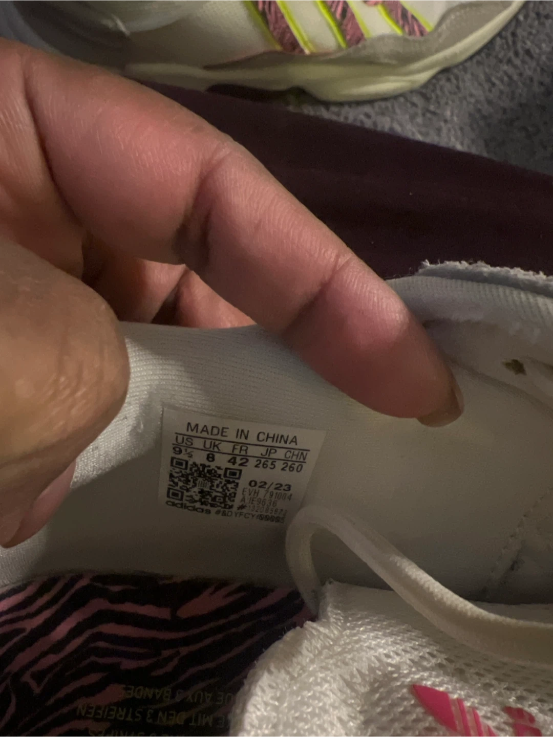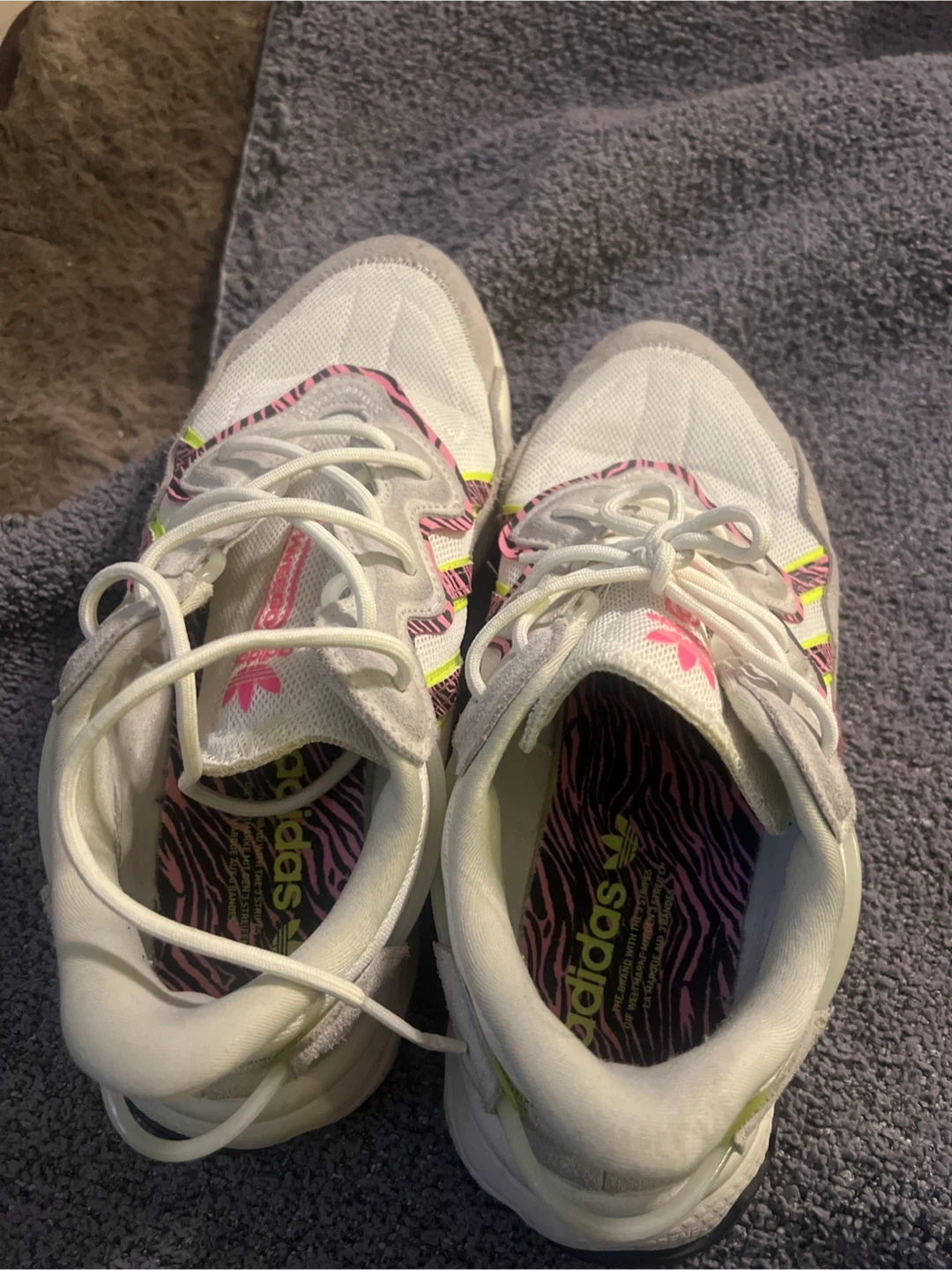 Adidas Ozweego sneakers in white with pink and yellow zebra accents. Made in China. US size 9 1/2. These shoes offer a comfortable fit for everyday wear.