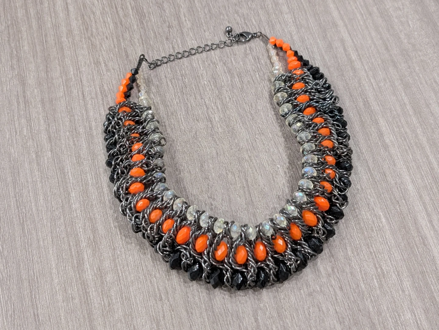 -Stunning statement bib necklace, features orange and black beads with clear accents. Metal chain and clasp.