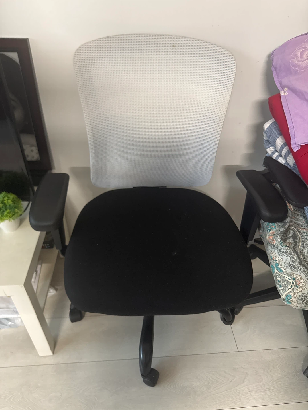 Selling a black office chair. It's in great shape and ready for a new home office setup! The chair features a comfortable seat and a supportive back, perfect for long workdays. It has adjustable armrests. Great for your home office.It has back vibrator as well
