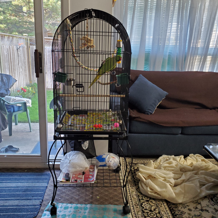 Large bird cage, no bird included. Used for my Indian Ringneck. Cage has been well taken care of and is cleaned regularly. The bottom tray comes out and also has a grate so that they aren't stepping in their own poo. Cage comes off the stand and also opens at the top. Will throw in some toys. Pick up only in Cambridge.