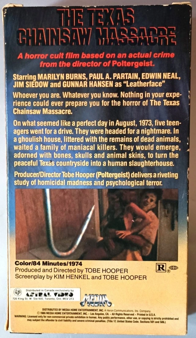 This is the 1974 film THE TEXAS CHAINSAW MASSACRE on VHS. Both the video and its original slipcover box are from 1984, with an "Astral Video" sticker on the back. The tape runs approximately 84 minutes in color. The spine label is slightly loose at the bottom, and the box shows some wear like corner dings from handling. Please see photos. No shipping. Available at a safe, public meet-up in downtown Kitchener. Price is firm.