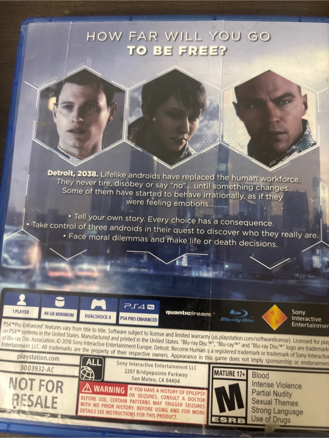 Detroit: Become Human for PlayStation 4. It's a narrative-driven adventure where players control three androids in a futuristic city. Your choices shape the story and lead to different outcomes.