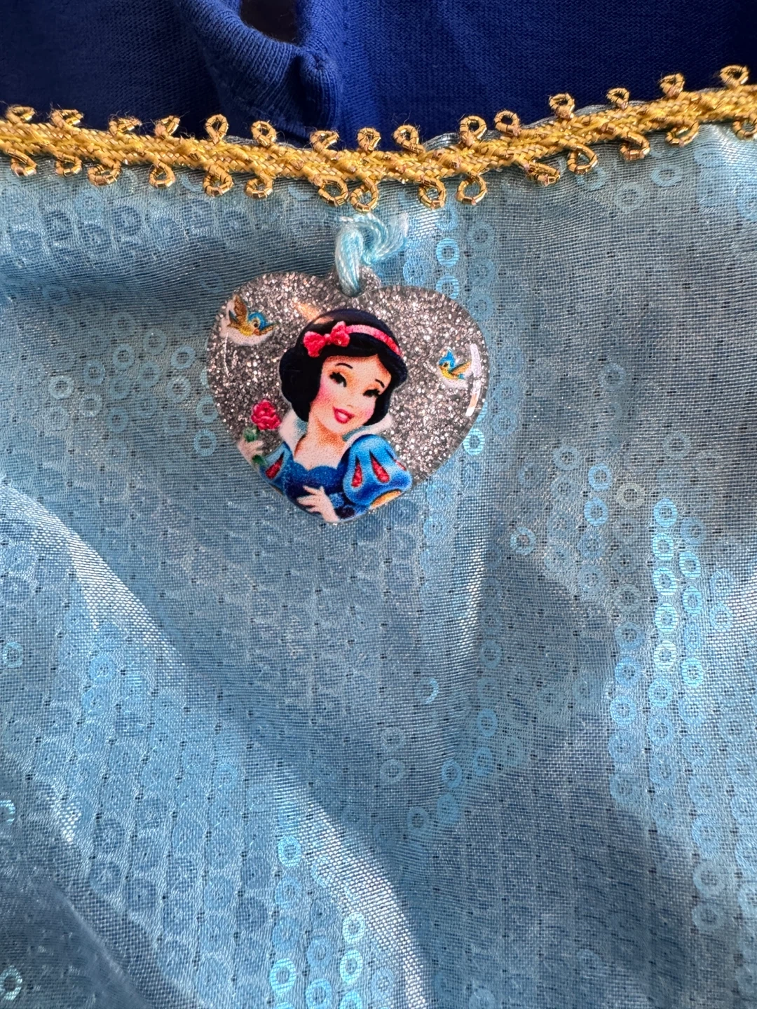 This costume dress features Snow White's iconic blue and yellow gown with red sleeves. It has a shiny sequined bodice and sparkly detailing on the skirt. A heart-shaped charm with Snow White's image is attached at the neckline.