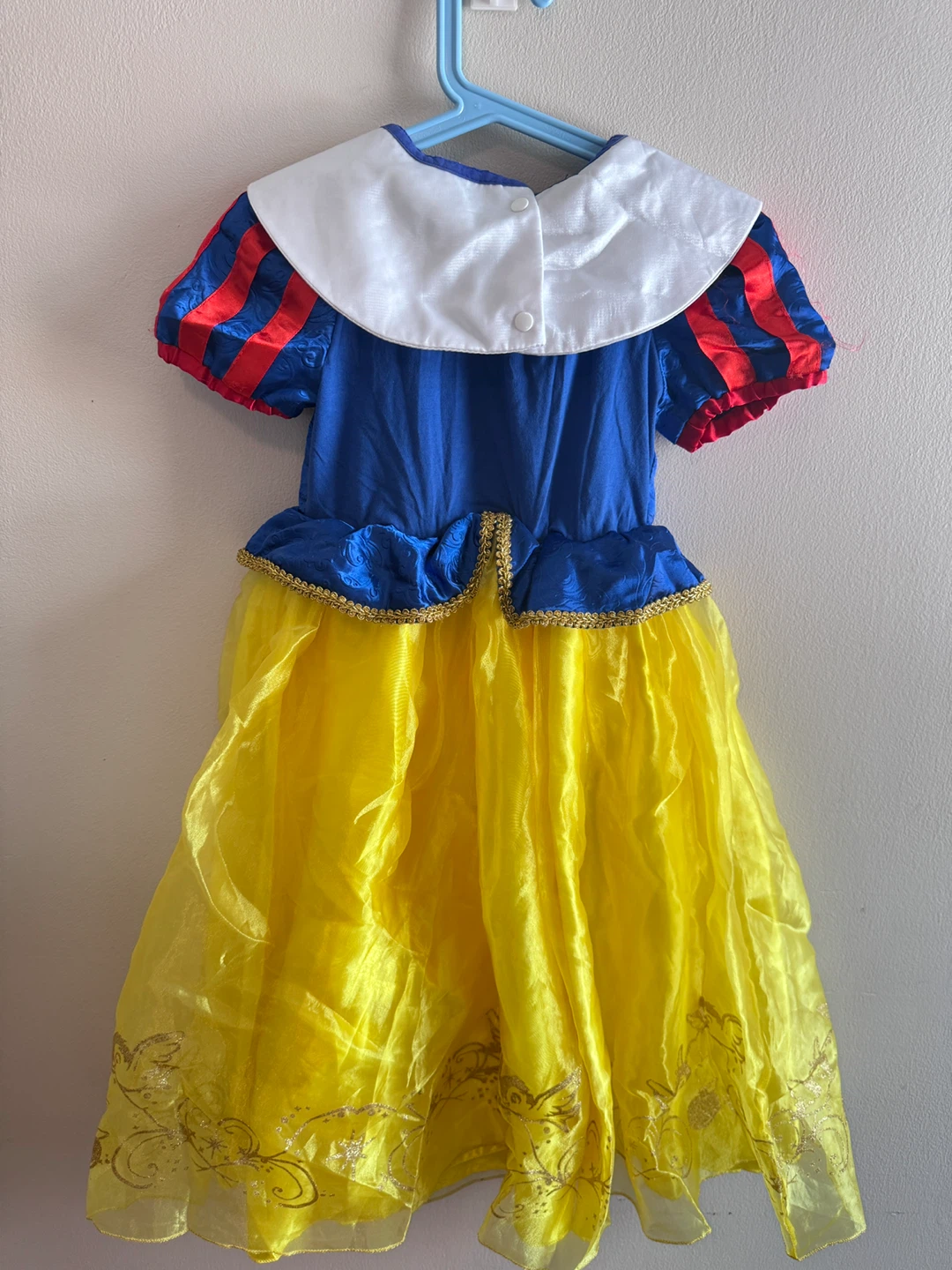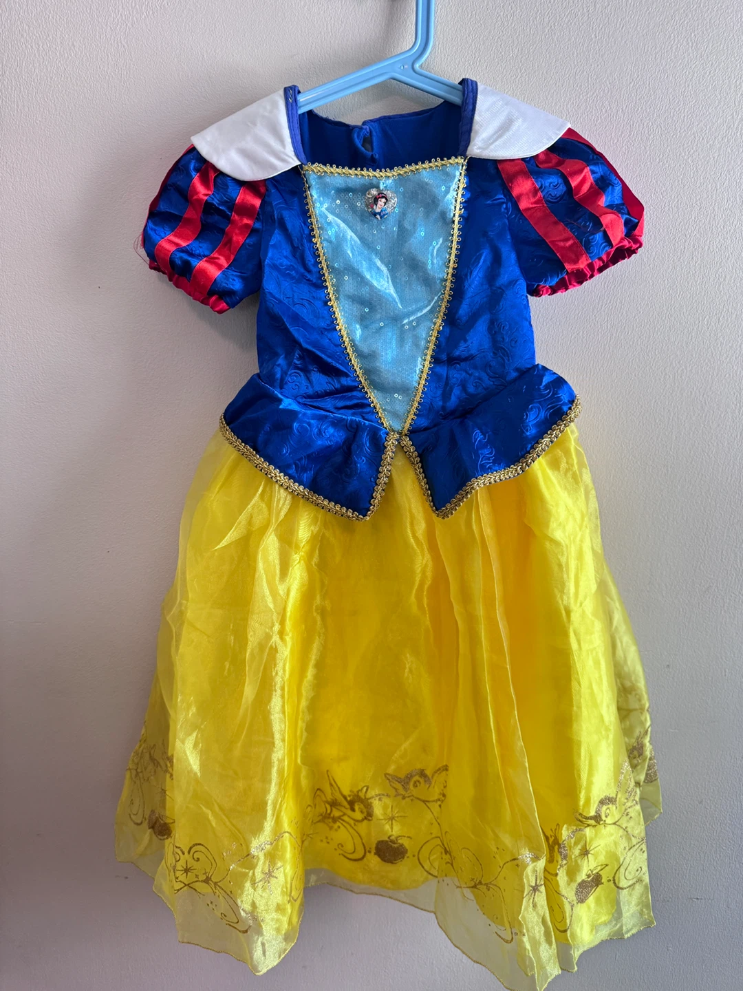 This costume dress features Snow White's iconic blue and yellow gown with red sleeves. It has a shiny sequined bodice and sparkly detailing on the skirt. A heart-shaped charm with Snow White's image is attached at the neckline.