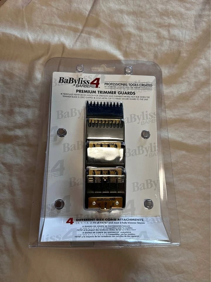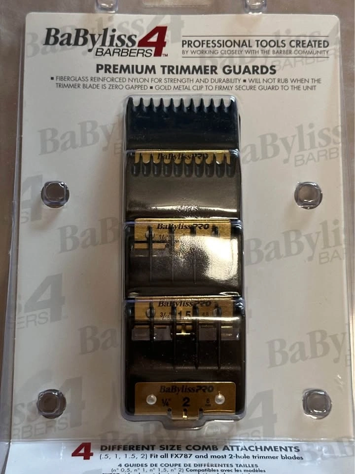 New BaBylissPRO premium trimmer guards. This pack includes 4 different sizes: .5, 1, 1.5, and 2. They fit the FX787 and most 2-hole trimmer blades. Located in Midtown Toronto.