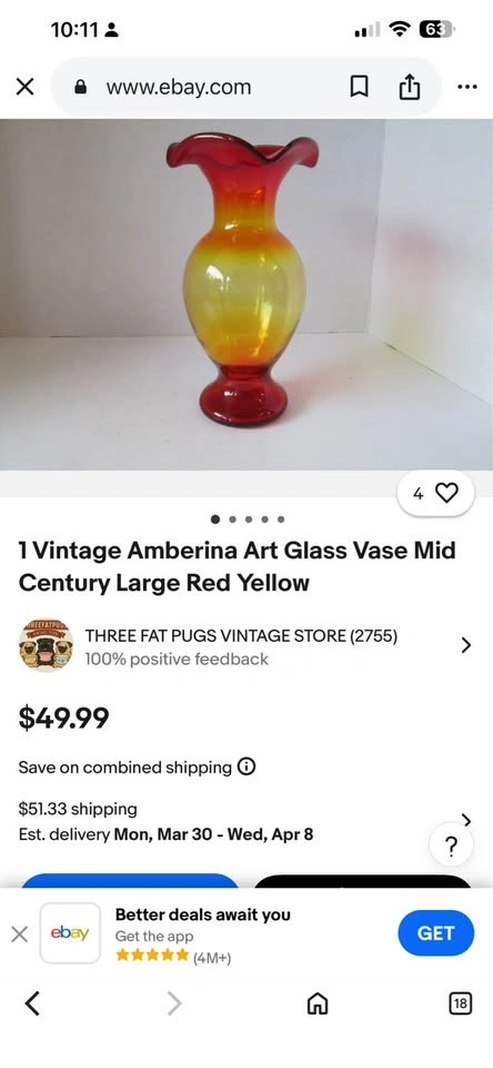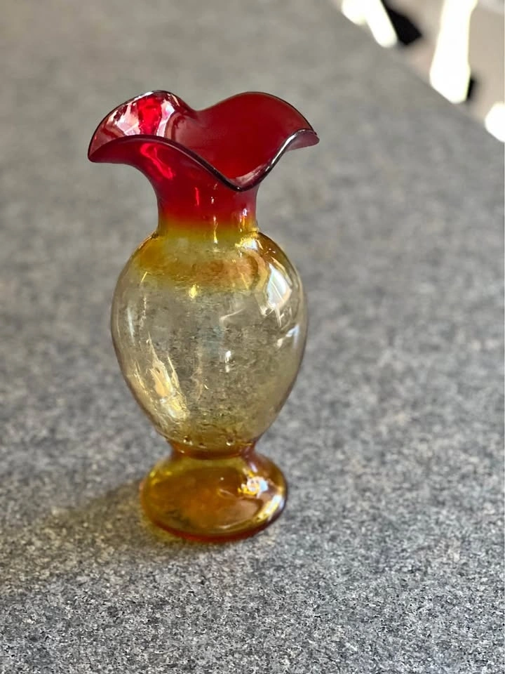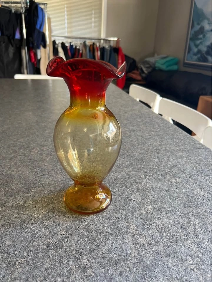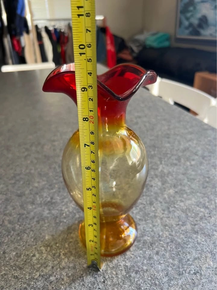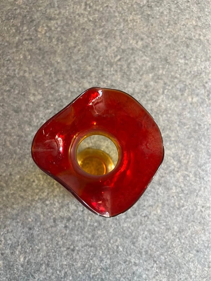 Beautiful large Amberina art glass vase with red and yellow tones, perfect for a Mid Century aesthetic. This piece comes from a movie set sale. Feel free to message if you have any questions!
